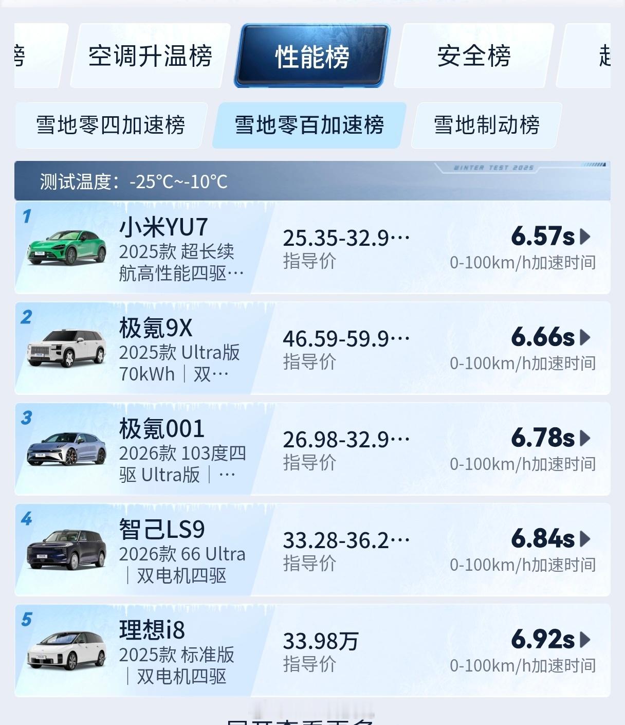 小米YU7冬季实测五项第一 之前小米YU7在汽车之家的“准冬测”拿下第一,一堆人不关心续航,就咬文嚼字小米。现在冬测小米YU7加速性能全场第一,SUV组内续航、能耗、充电效率均第一,不知道这次喷子该咋说了。连小编都表示:别刷“小米之家”啊零下25-20℃,YU7续航319公里,领先特斯拉近80公里,特斯拉更小更轻续航达成率和能耗还更差,特斯拉的三电能力,在这种寒冬条件下的表现,已经被反超了。去年SU7冬测全场续航第一,今年YU7又是SUV第一。谁说小米卖的好都是靠营销,产品实力是实打实的强。 雷军回应小米YU7冬测成绩