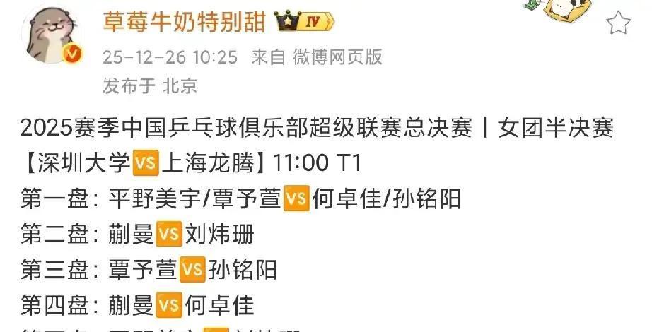把孙颖莎拿掉,深圳大学反而赢了。 昨天乒超决赛,深大对上海龙腾。赛前所有人都在问:孙颖莎不上怎么打?结果,三个年轻人打了场让热搜炸锅的球。18岁的覃予萱搭档平野美宇,双打先抢下一分。最关键的一单,蒯曼在王艺迪手里,硬是3-2翻盘。 平野美宇的反手像开了刃,单双打两分到手,直接锁定MVP。上海队只有陈熠扳回一局。3-1。没有绝对核心,人人都是核心。蒯曼赛后说:“莎姐不在,我们得把场子撑起来。” 莎莎本人发了个加油视频,播放冲过500万。 莎莎的右肩需要休养到一月,这是国家队医疗组的硬规定。保护王牌,比一场胜利更重要。但昨天,聚光灯打在了下一代身上。话题 乒超青春风暴 冲上微博,你看到的不只是一场爆冷。 你看到的是一股冲击:最强的盾,是当你的软肋消失时,长出的新骨骼。蒯曼、平野、覃予萱,用一场胜利完成了交接。这不是损失主力的无奈,而是主动掀起的风暴。 老将养锋,少年拔剑。这出戏,比剧本精彩。