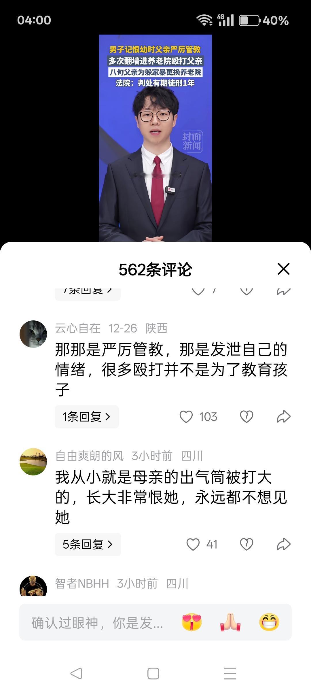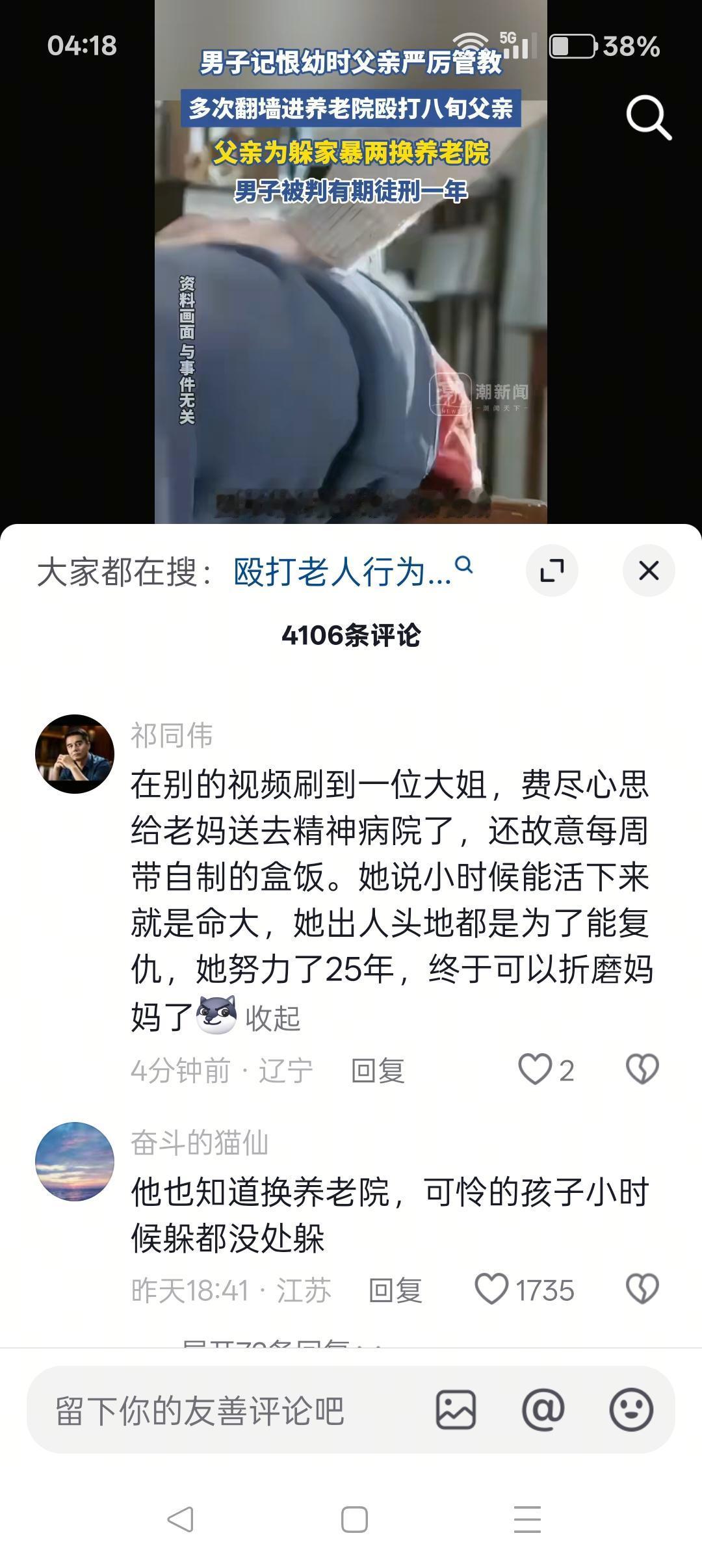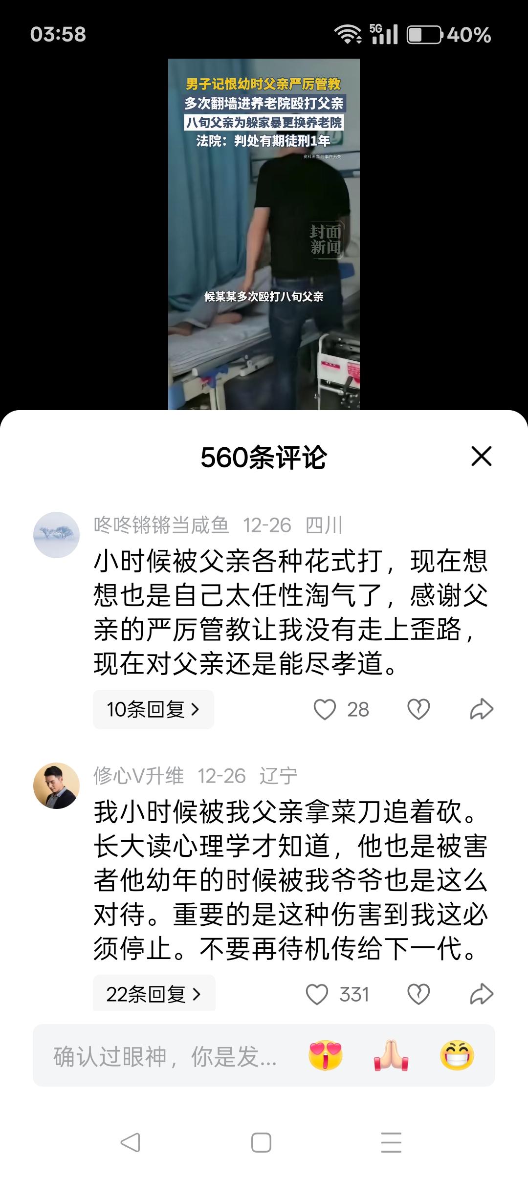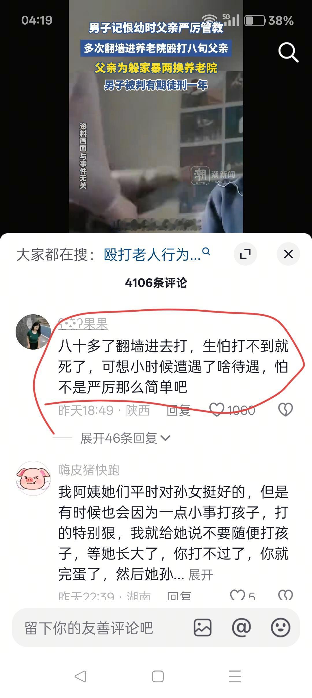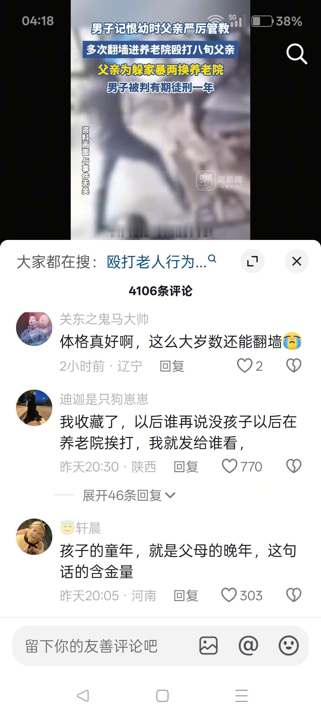 殴打八旬老父亲,为什么网友不轻易同情老人、谴责儿子? 山西运城闻喜县男子侯某某,因记恨幼时父亲“严厉管教”,多次翻墙进入养老院殴打八旬父亲,而且不履行赡养义务,最终被法院判处有期徒刑一年。 从法律上讲,多次翻墙进养老院殴打八旬老人,不履行赡养义务,这情节恶劣。判刑一年没毛病。 虽然媒体未说清楚老人当年“严厉管教”的详情,但是从侯某某的表现来看,恐怕当年情况非常恶劣。 毕竟作为一个中年男人,应该心智成熟、性情稳厚,而且幼时的故事已经过了那么多年,早该放下了,但他不履行赡养义务,还多次翻墙进养老院殴打,生怕还没打够就死了,可见对父亲仇恨之深——应该是幼年受尽了虐待。 多数网友没有盲目地同情老人,反而纷纷讲述自己童年被父母肆意殴打辱骂的不幸经历。这证明,并不是所有的父母都爱惜儿女,天下没有不是的父母太言过其实。 常言道,父慈子孝。为人父母只有善待儿女,年老后才有可能得到儿女的孝顺。否则,将来很可能受到儿女的报复,最终自食恶果。