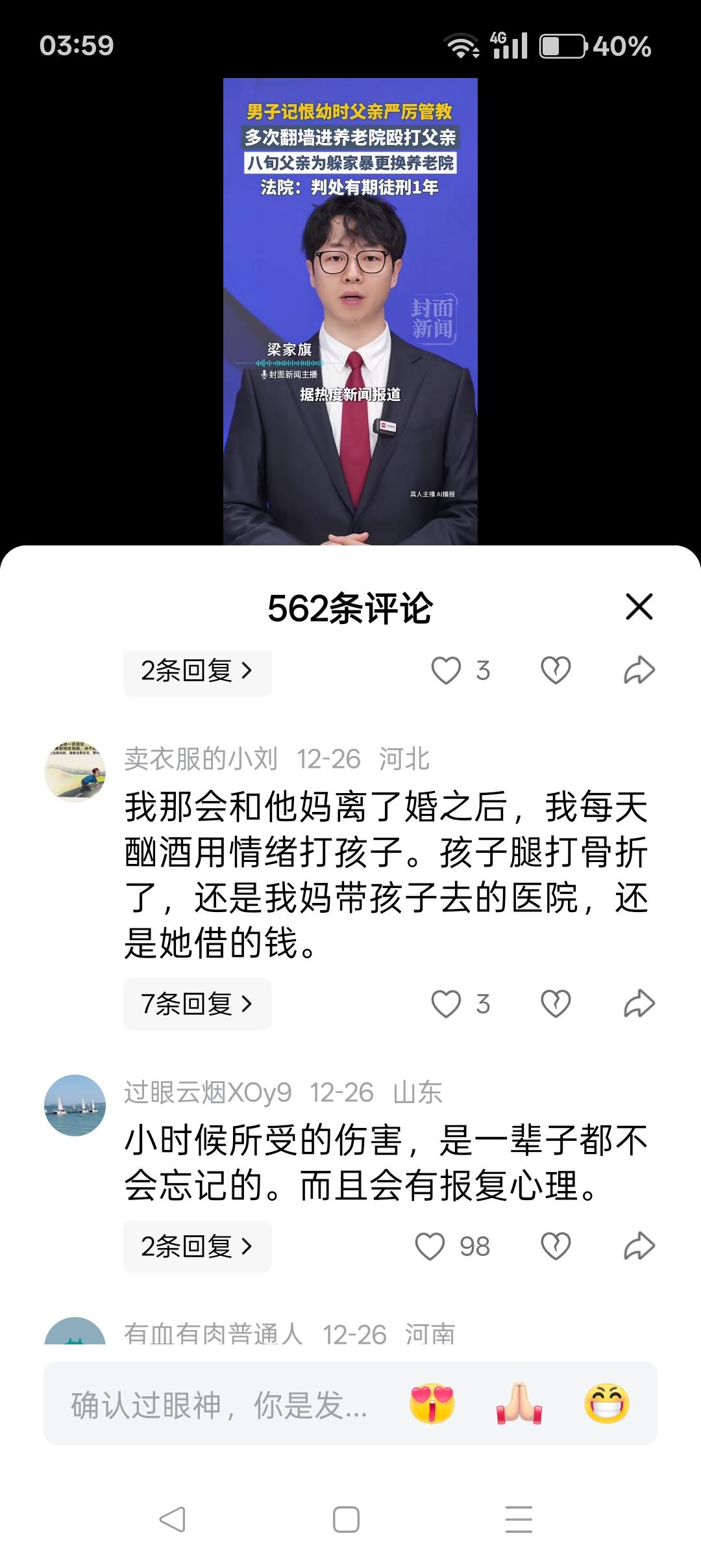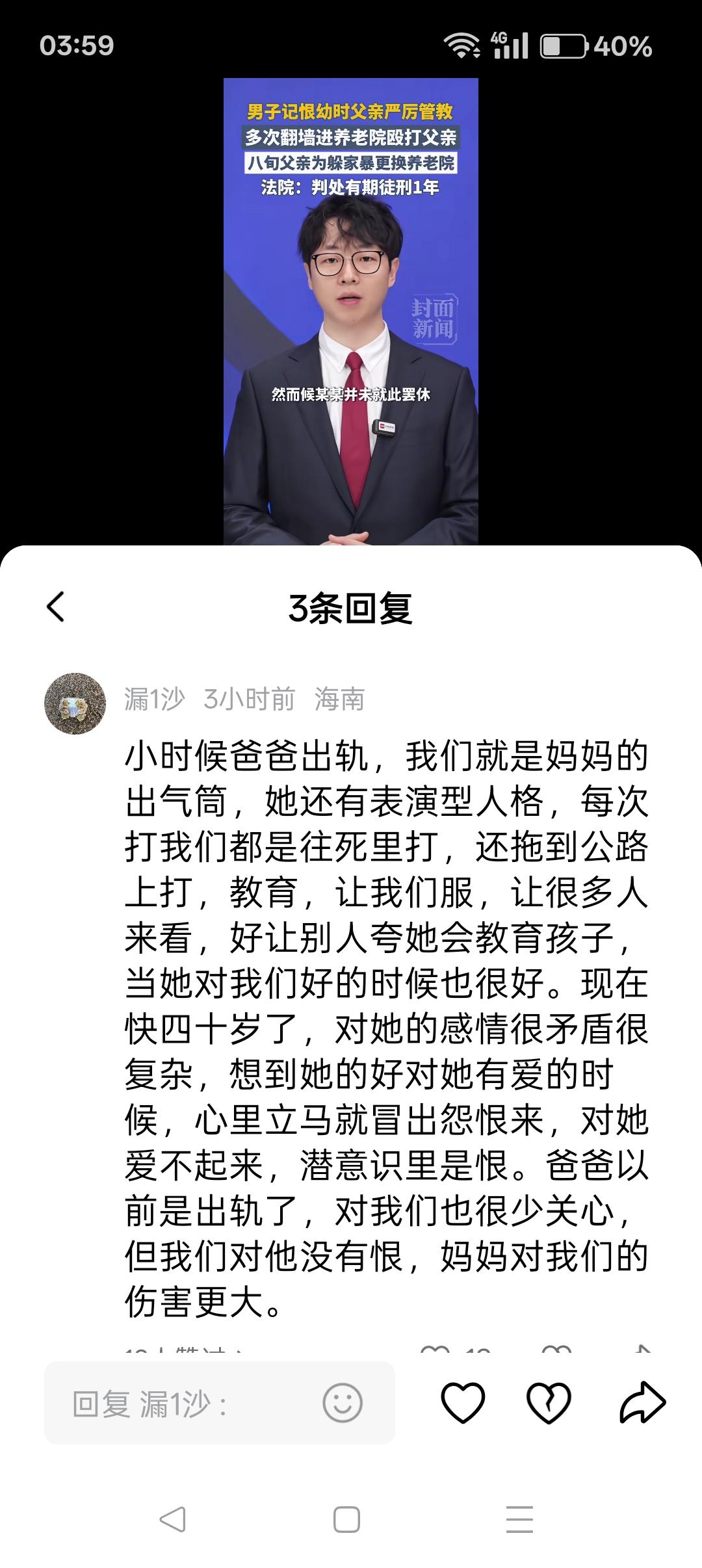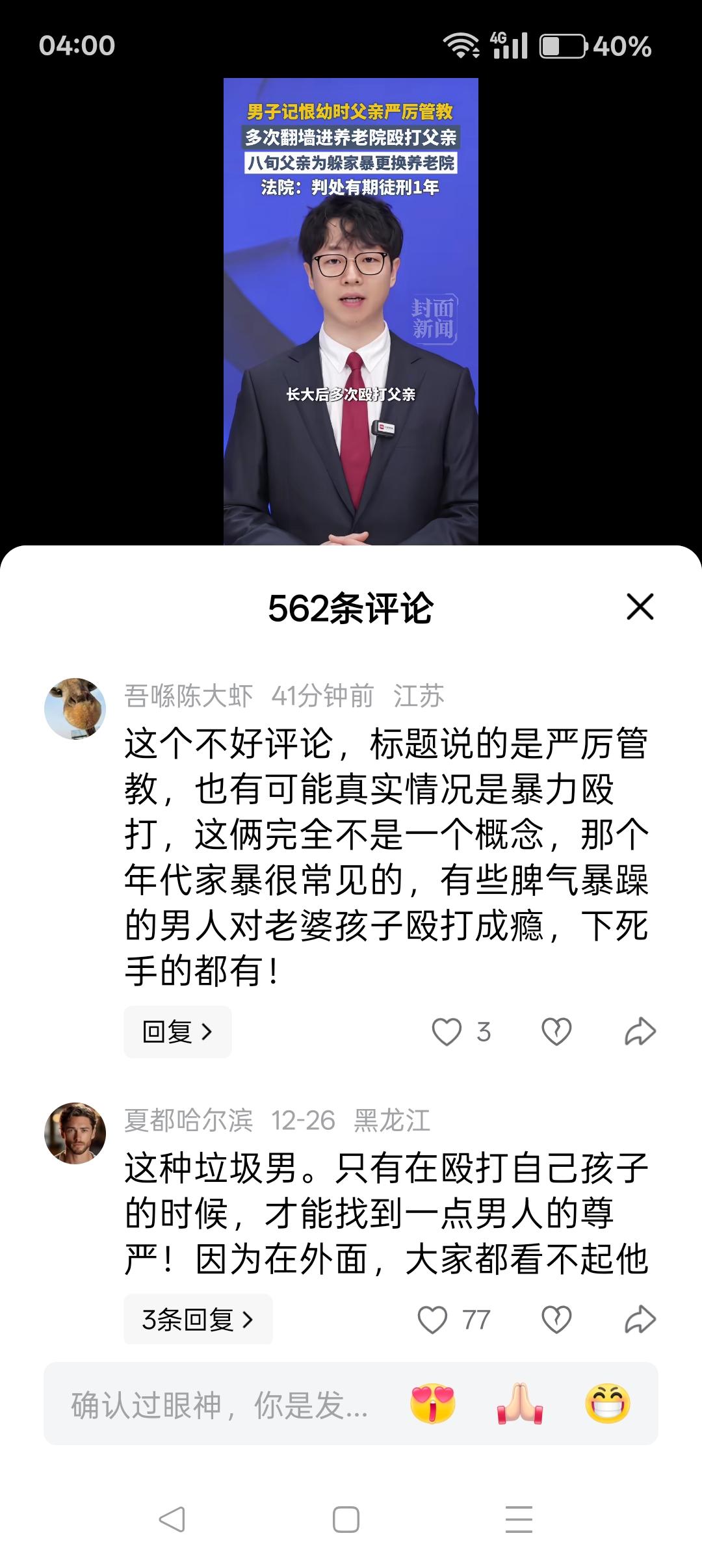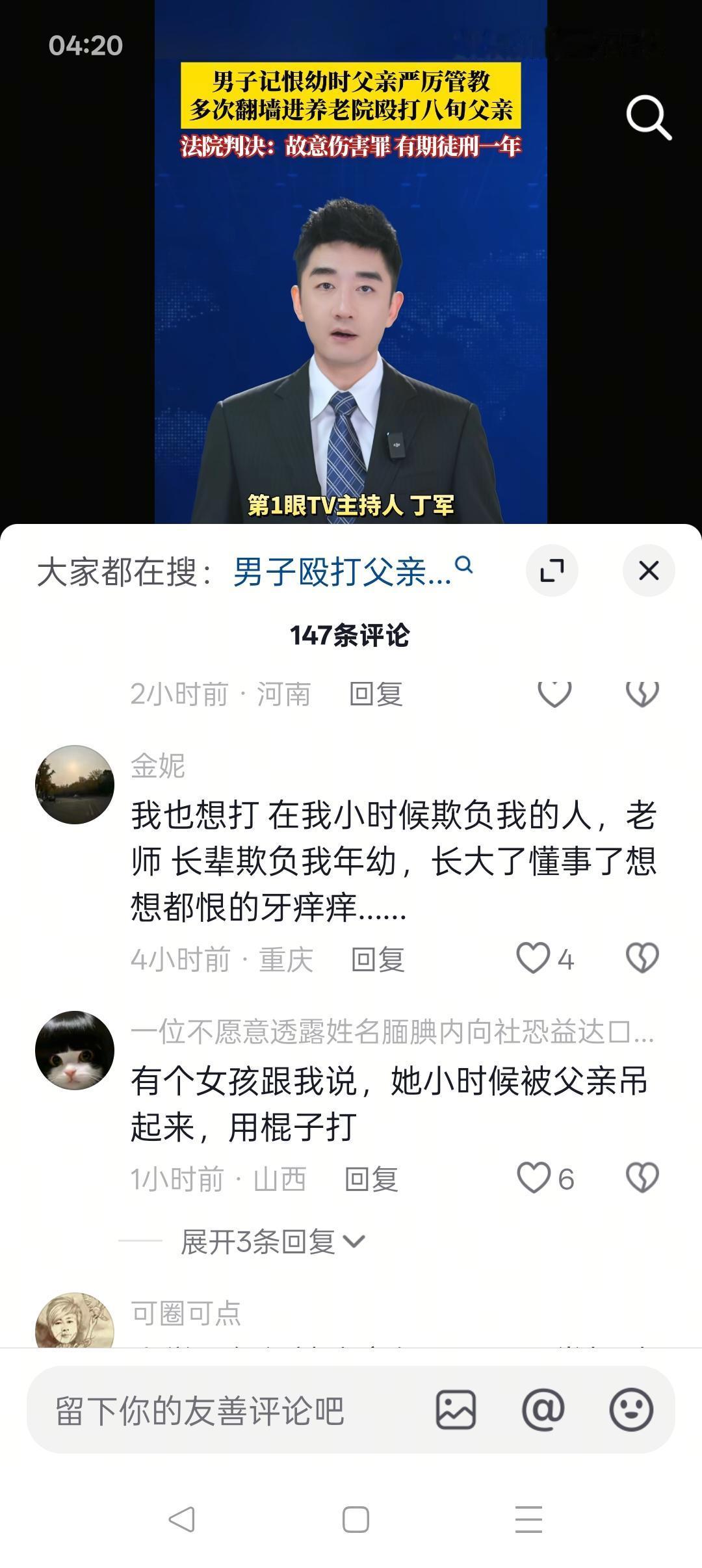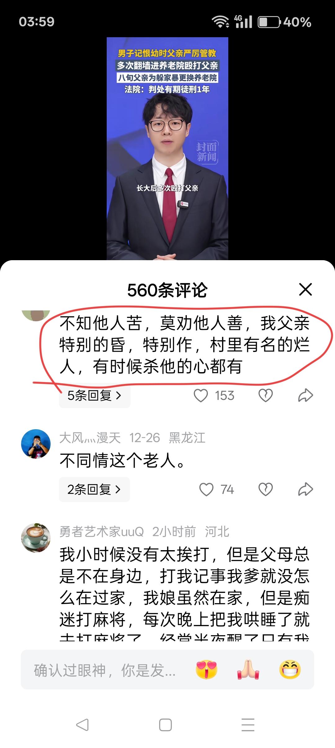 殴打八旬老父亲,为什么网友不轻易同情老人、谴责儿子? 山西运城闻喜县男子侯某某,因记恨幼时父亲“严厉管教”,多次翻墙进入养老院殴打八旬父亲,而且不履行赡养义务,最终被法院判处有期徒刑一年。 从法律上讲,多次翻墙进养老院殴打八旬老人,不履行赡养义务,这情节恶劣。判刑一年没毛病。 虽然媒体未说清楚老人当年“严厉管教”的详情,但是从侯某某的表现来看,恐怕当年情况非常恶劣。 毕竟作为一个中年男人,应该心智成熟、性情稳厚,而且幼时的故事已经过了那么多年,早该放下了,但他不履行赡养义务,还多次翻墙进养老院殴打,生怕还没打够就死了,可见对父亲仇恨之深——应该是幼年受尽了虐待。 多数网友没有盲目地同情老人,反而纷纷讲述自己童年被父母肆意殴打辱骂的不幸经历。这证明,并不是所有的父母都爱惜儿女,天下没有不是的父母太言过其实。 常言道,父慈子孝。为人父母只有善待儿女,年老后才有可能得到儿女的孝顺。否则,将来很可能受到儿女的报复,最终自食恶果。