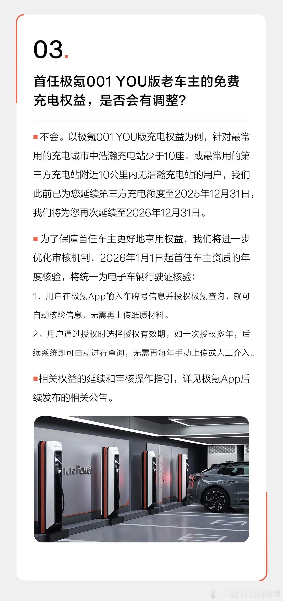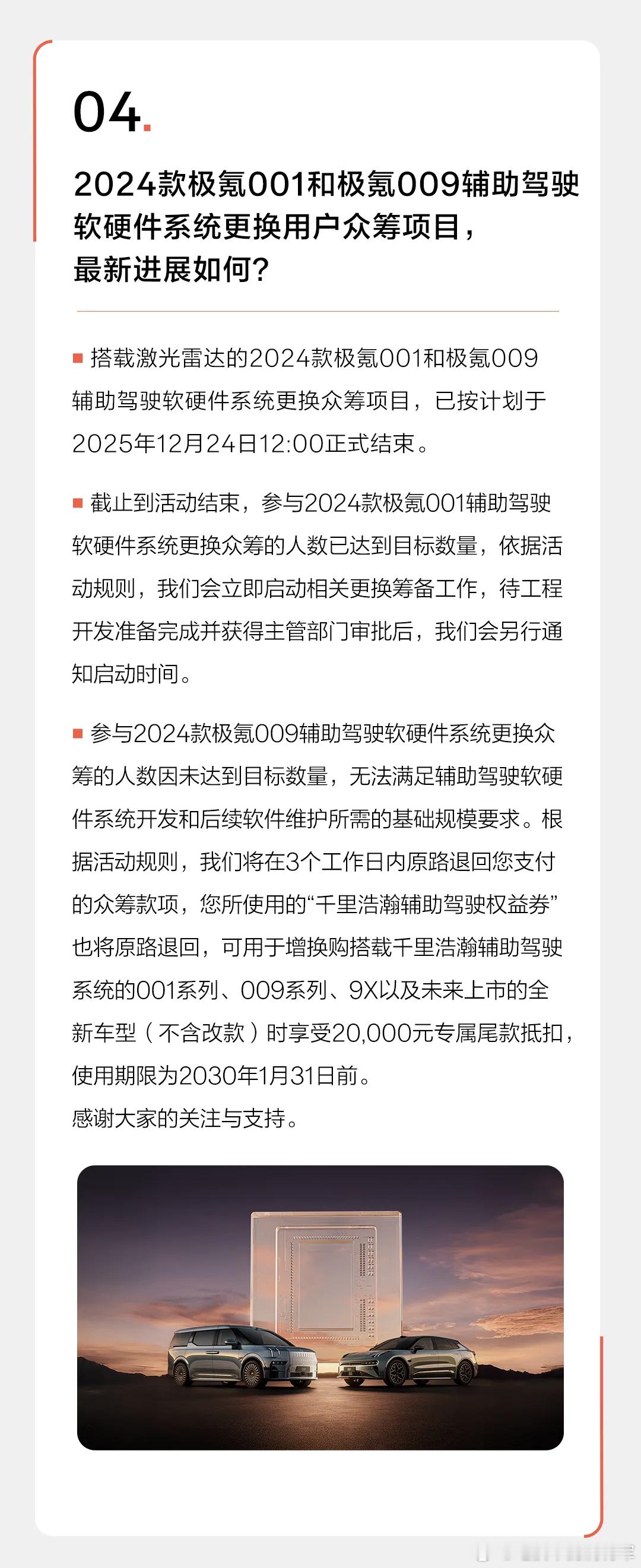 极氪新一期的公告来了,主要说了3个大事:1.三电终身质保要求一年的行驶里程不大于6万公里,过渡期到26.3.31截止。在过渡期三电终身质保还是执行老办法,过渡期之后执行新办法。2.针对老001车主的第三方终身充电权益又延长一年到26.12.31。3.关于智驾更新众筹:24款001确认成功,会开启申报和后续手续,24款009没有成功,后续确认也不会开启,已经付款的用户会进行退款处理。不得不说这次极氪还是用心了的,相关问题也提前公告了,想看的可以看看哈极氪