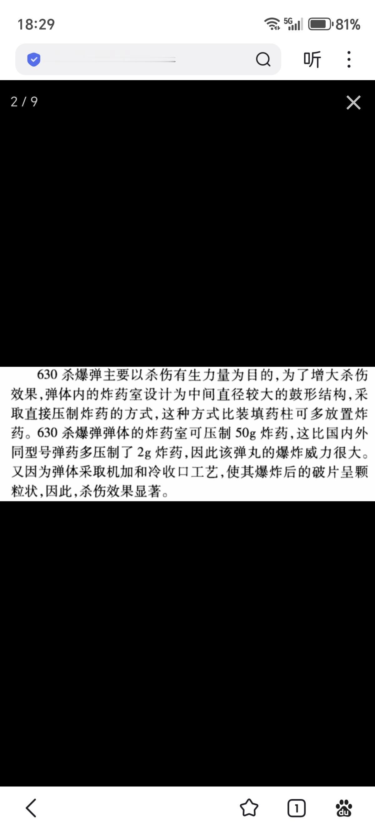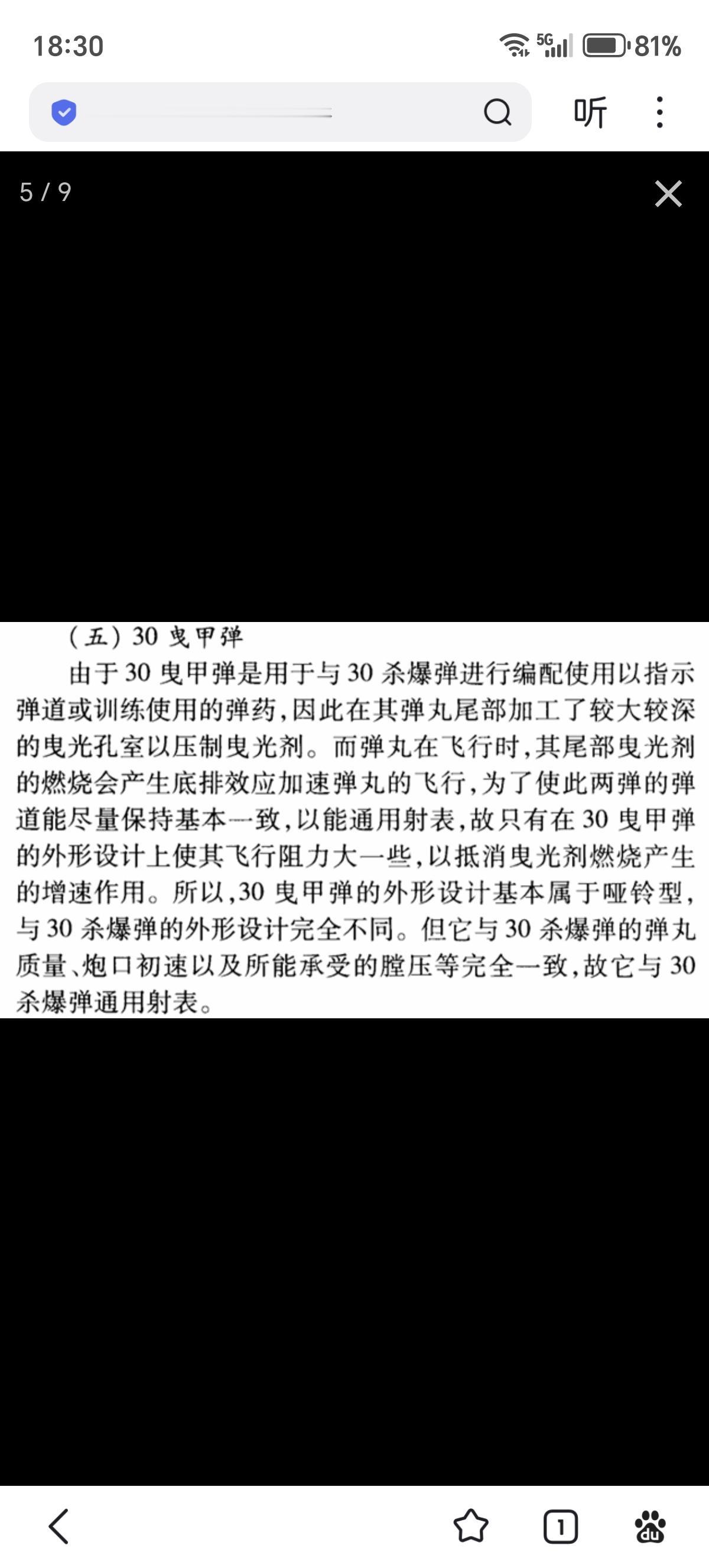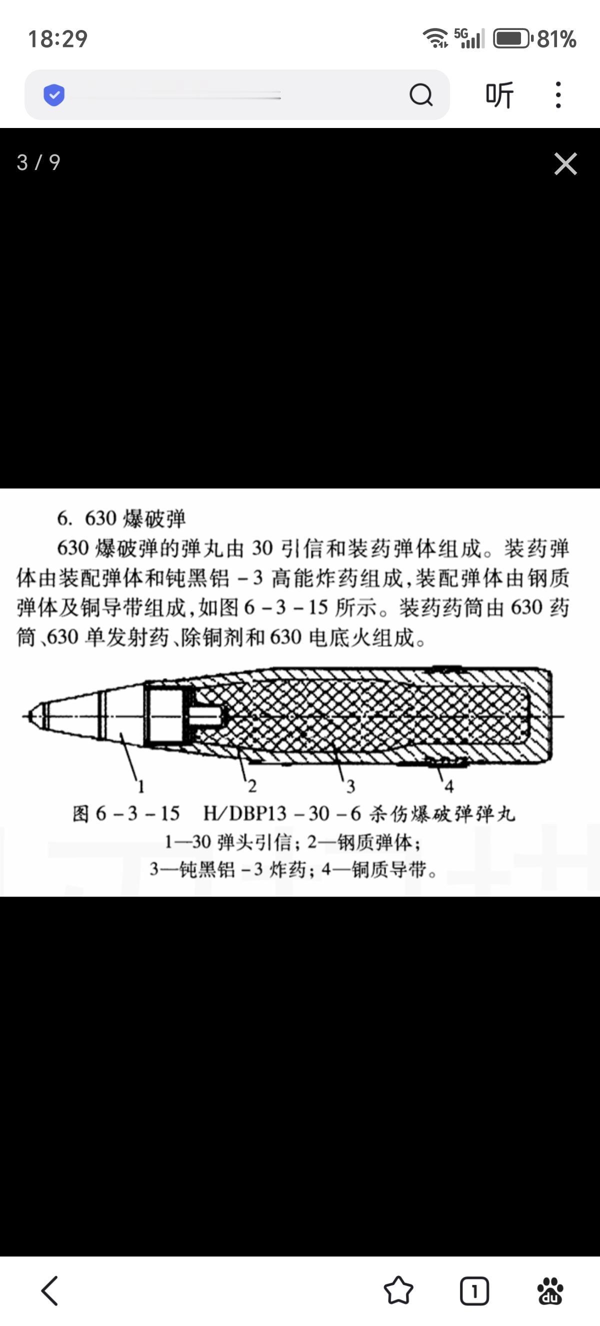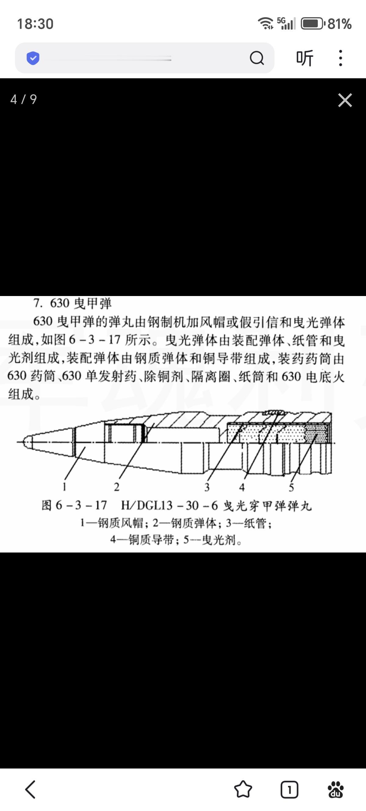 H/PJ-13和升级版H/PJ-13,简称630舰炮,630舰炮具有以下特点: (1)射速高; (2)射击精度高; (3)可靠性高; (4)体积小、质量小、电功耗小; (5)反应速度快; (6)持续射击时间长(因采用循环水冷却,可以长达数秒连发); (7)适装性好; (8)舰炮隐身性能好。 H/PJ-13主要使用杀爆弹和曳光穿甲弹(简称曳甲弹,结构见图4,这是种全口径穿甲弹,风帽下是钝头钢穿甲体,类似毛子的3UBR6, 不是脱壳穿甲弹,穿甲能力略差),必要时也可以使用30*165mm APDS(俗称钢针,该弹主要给730用),但是可能发挥不出APDS的威力?可能是炮管太短导致初速不够? H/PJ-13配备的630杀爆弹主要以杀伤有生力量为目的,为了增大杀伤效果,弹体内的炸药室设计为中间直径较大的鼓形结构,采取直接压制炸药的方式,这种方式比装填药柱可多放置炸药。630杀爆弹弹体的炸药室可压制50g钝黑铝炸药,这比国内外同型号弹药多压制了2g炸药,因此该弹丸的爆炸威力很大。又因为弹体采取机加和冷收口工艺,使其爆炸后的破片呈颗粒状,因此,杀伤效果显著。 由于30曳甲弹是用于与30杀爆弹进行编配使用以指示弹道或训练使用的弹药,因此在其弹丸尾部加工了较大较深的曳光孔室以压制曳光剂。而弹丸在飞行时,其尾部曳光剂的燃烧会产生底排效应加速弹丸的飞行,为了使此两弹的弹道能尽量保持基本一致,以能通用射表,故只有在30曳甲弹的外形设计上使其飞行阻力大一些,以抵消曳光剂燃烧产生的增速作用。所以,30曳甲弹的外形设计基本属于哑铃型,弹头中央有一圈凹槽,以增加空气阻力,与30杀爆弹的外形设计完全不同。但它与30杀爆弹的弹丸质量、炮口初速以及所能承受的膛压等完全一致,故它与30杀爆弹通用射表。30曳甲弹和30杀爆弹初速均为890米/秒,可以推测炮管为54倍径,和AK630相同。 H/PJ-13比76A双37好多了,南海岛礁上也装备了H/PJ-13,扫射越猴。