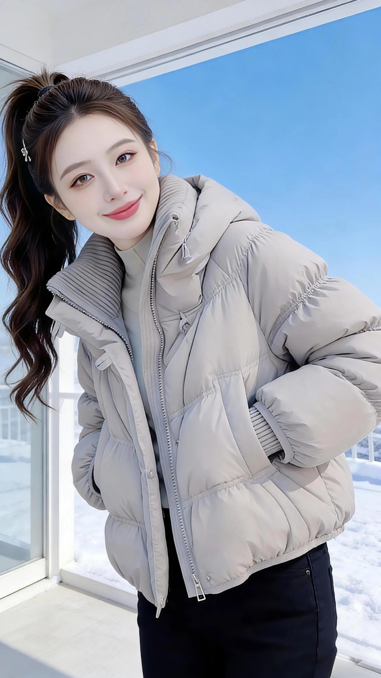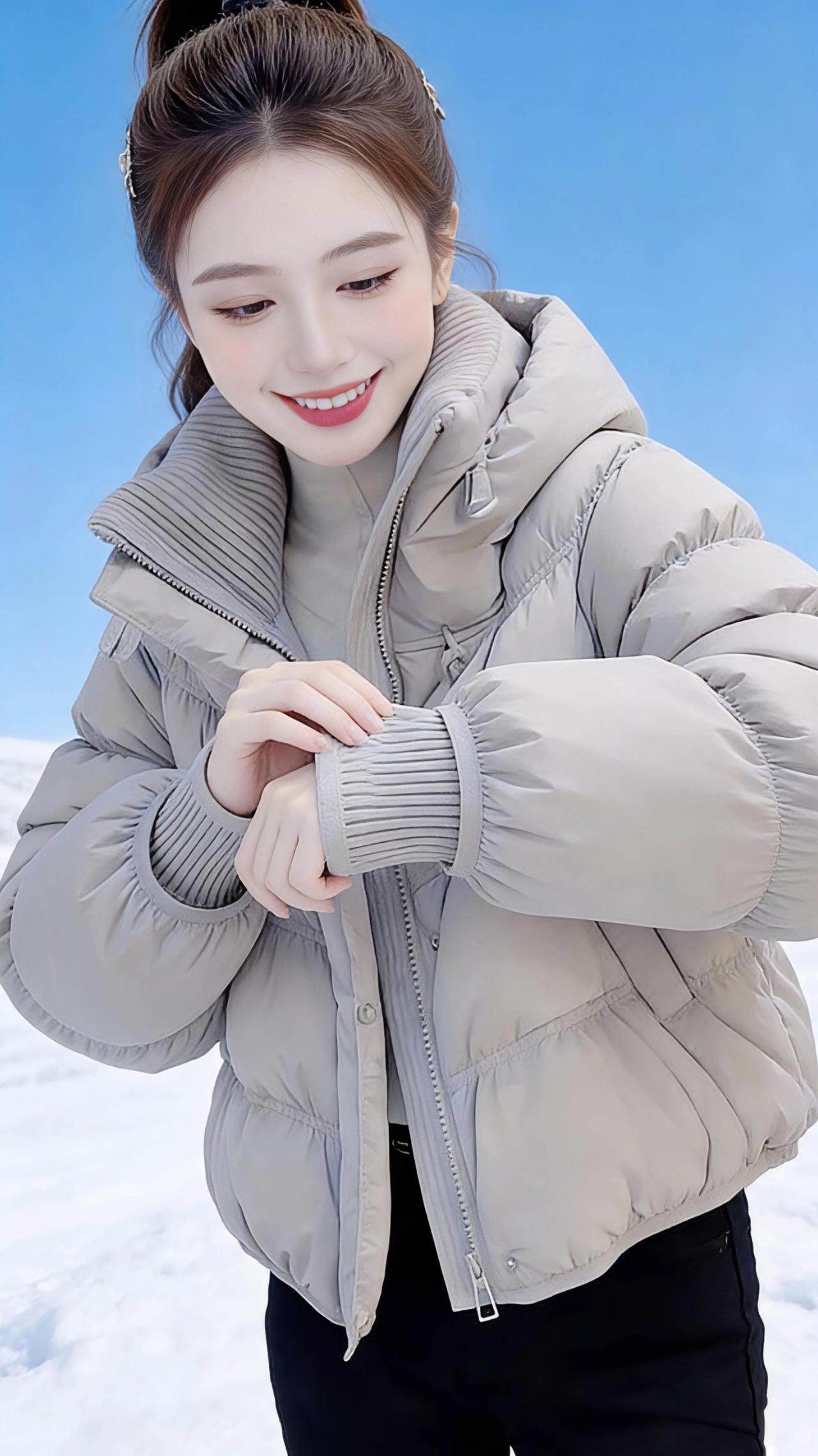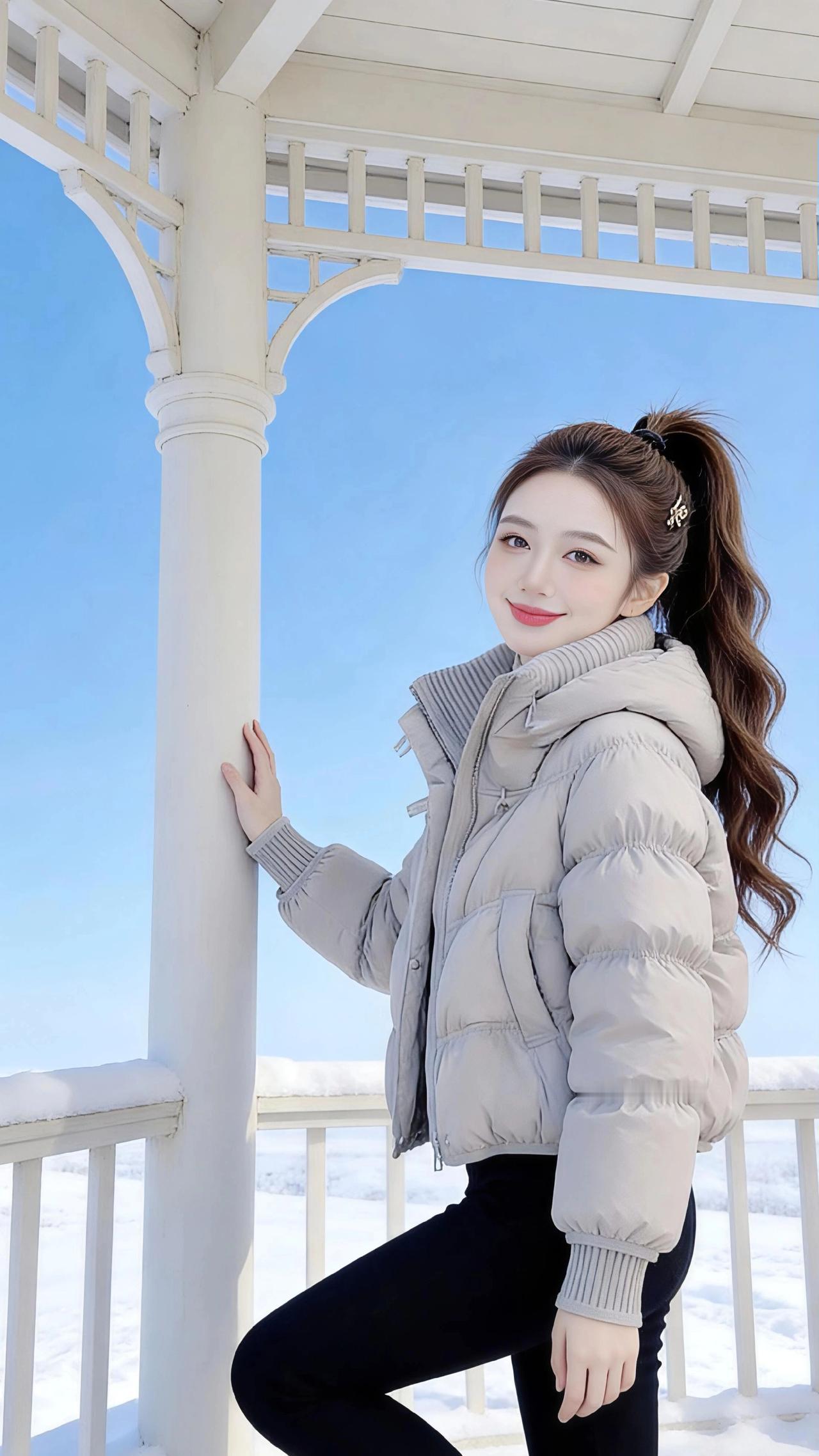 雪色里的温柔序章 冬日的风掠过雪原,澄澈的蓝天像一块被水洗过的蓝宝石,将天地间的白衬得愈发纯粹。凉亭的白柱积着薄雪,雕花的栏杆凝着霜,而她就站在这雪色与天光之间,成了冬日里最鲜活的一抹温柔。 高马尾在脑后束成利落的弧度,发梢的卷翘随微风轻轻晃,像枝头未落的雀羽。浅灰色的羽绒服裹着暖意,针织的领口与袖口勾勒出柔和的线条,拉链处的褶皱藏着蓬松的温柔,黑色的裤装又添了几分利落,与雪地的白撞出干净的层次感。她的指尖轻触羽绒服的拉链,笑意从眼角漾开,冷白皮在雪光里衬得愈发透亮,唇间的红是冬日里偷藏的甜。 有时她抬手理理发梢,指尖划过耳际的弧度轻软;有时手插在衣兜,身体微微侧着,目光望向远处的雪原,笑意里裹着对冬日的欢喜;又或是倚着凉亭的柱子,单腿轻弯,掌心贴在微凉的柱面上,雪粒落在栏杆上的细碎声响,都成了这画面的背景音。她拢了拢袖口的针织边,低头时的笑意温柔,仿佛在与这冬日的雪悄悄私语。 风掠过雪原,掀动她的衣摆,也掀动了这一方天地的温柔。雪是静的,天是蓝的,而她是动的,是雪色里跳脱的诗,是冬日天光里揉碎的甜,把平凡的冬日瞬间,酿成了藏在时光里的温柔序章。 高级感穿搭 小个子穿搭 冬季穿搭 小个子穿搭