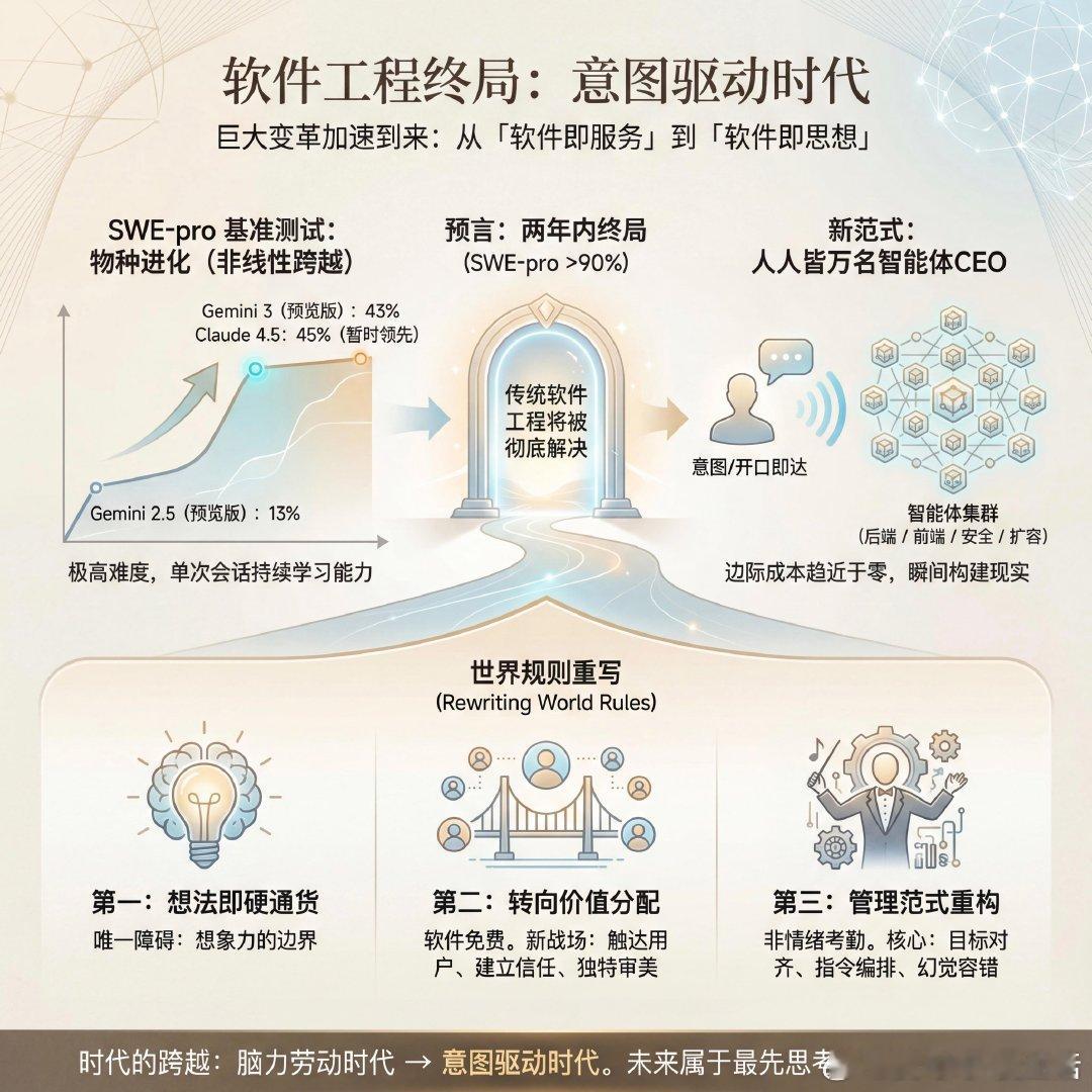 没有人知道未来究竟会发生什么,但每个人都能感受到,某种巨大的变革正在加速到来。过去18个月,我们见证了计算机科学史上最迅猛的进步。如果说过去是软件即服务,那么未来将是软件即思想。当你开口表达意图,由数十亿个实例组成的集群会在几分钟内完成后端、前端、安全和扩容架构。软件工程的终局可能就在这两年内。衡量这一变革的关键指标是SWE-pro基准测试。这是一个为了防止数据污染而设计的极高难度测试,要求模型具备在单次会话中从失败中持续学习的能力。Gemini 2.5预览版的得分是13%,而Gemini 3预览版直接跳升至43%,Claude 4.5则以45%暂时领先。这种跨越式的增长并非线性改进,而是物种进化。当模型在这一基准测试达到90%到100%时,传统意义上的软件工程将被彻底解决。这意味着在两年内,任何拥有想法的人都可以成为一家拥有万名智能体员工公司的CEO。你不再需要亲自管理每一个细节,而是通过调度智能体集群,将意图瞬间转化为现实。当生产软件的边际成本趋近于零,世界的规则将重新改写:第一,想法成为唯一的硬通货。过去阻碍创意落地的是技术门槛、资金和团队规模,未来唯一的障碍是你想象力的边界。第二,从制造价值转向分配价值。当每个人都能在几分钟内克隆出一个功能完备的应用时,软件本身将变得廉价甚至免费。此时,如何触达用户、如何建立信任、如何定义独特的审美,将成为真正的战场。第三,管理范式的重构。管理一万个智能体与管理一万个人完全不同。这不再是关于情绪调节和考勤,而是关于目标对齐、指令编排和对幻觉的容错控制。这不仅是技术的更迭,更是人类生产力的一次重组。我们正从脑力劳动时代跨入意图驱动时代。正如推文中所言,未来不会等待许可,它将被那些最先思考它的人所构建。既然没有人能确切预知未来,我们唯一能做的,就是思考如何在这个即将到来的智能体时代,为自己占据一个更有利的位置。x.com/chatgpt21/status/2004433900794241329