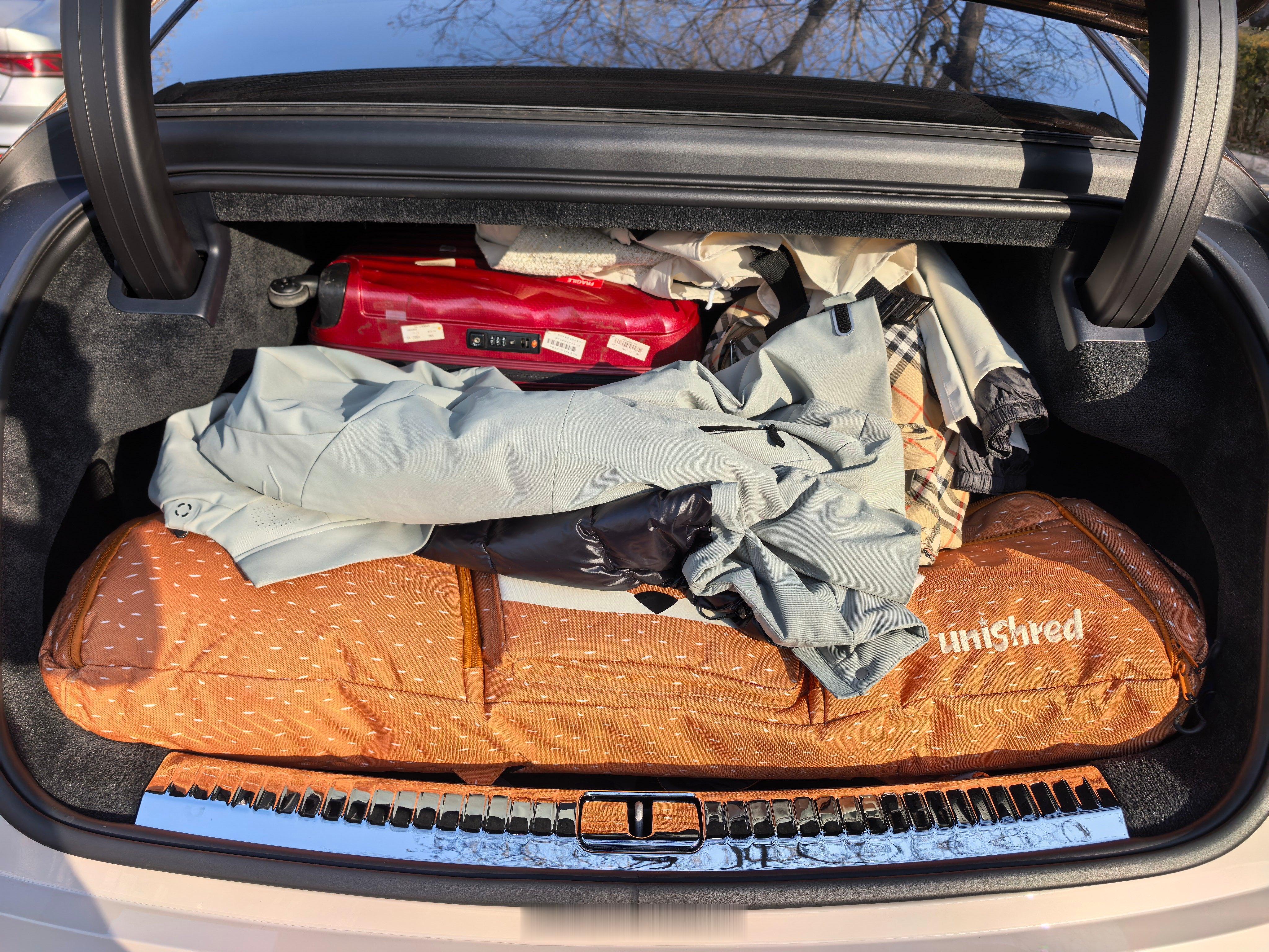 年初一家三口去滑雪的场景,后备箱是真不够。这里面还没有我跟媳妇的雪具,副驾已经被