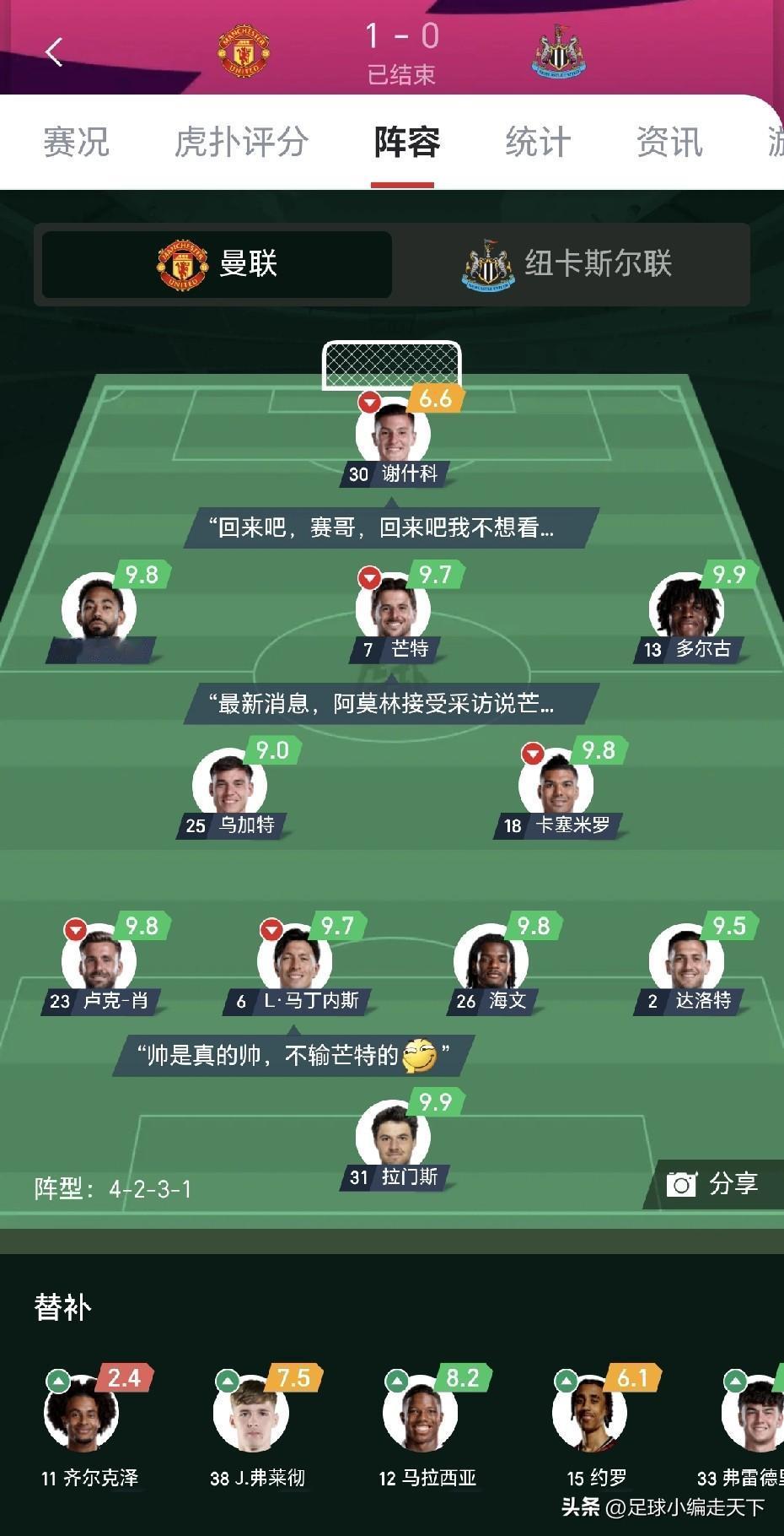 节礼日之王曼联又回来了!我记得小时候看英超联赛,就是到这个阶段开始曼联抢分的。 那时候所谓的圣诞快车,就是赛程密集,但曼联往往发挥出色一个是节礼日还有重要原因12.31是老爵爷弗格森的生日,球员都跟打鸡血一样, 一般在这会积分就追上阿森纳了。 我还记得爵爷还说过,三月才是联赛真正的开始,曼联也差不多那会反超积分登顶,那会不止一个赛季是我说的这样。 这场比赛充分说明: 齐尔是真的废 多古是真够神 狼王是真红魔 纽卡是真的菜 林子是真能整活 你魔是真有流量 谁能想到这场居然零封……