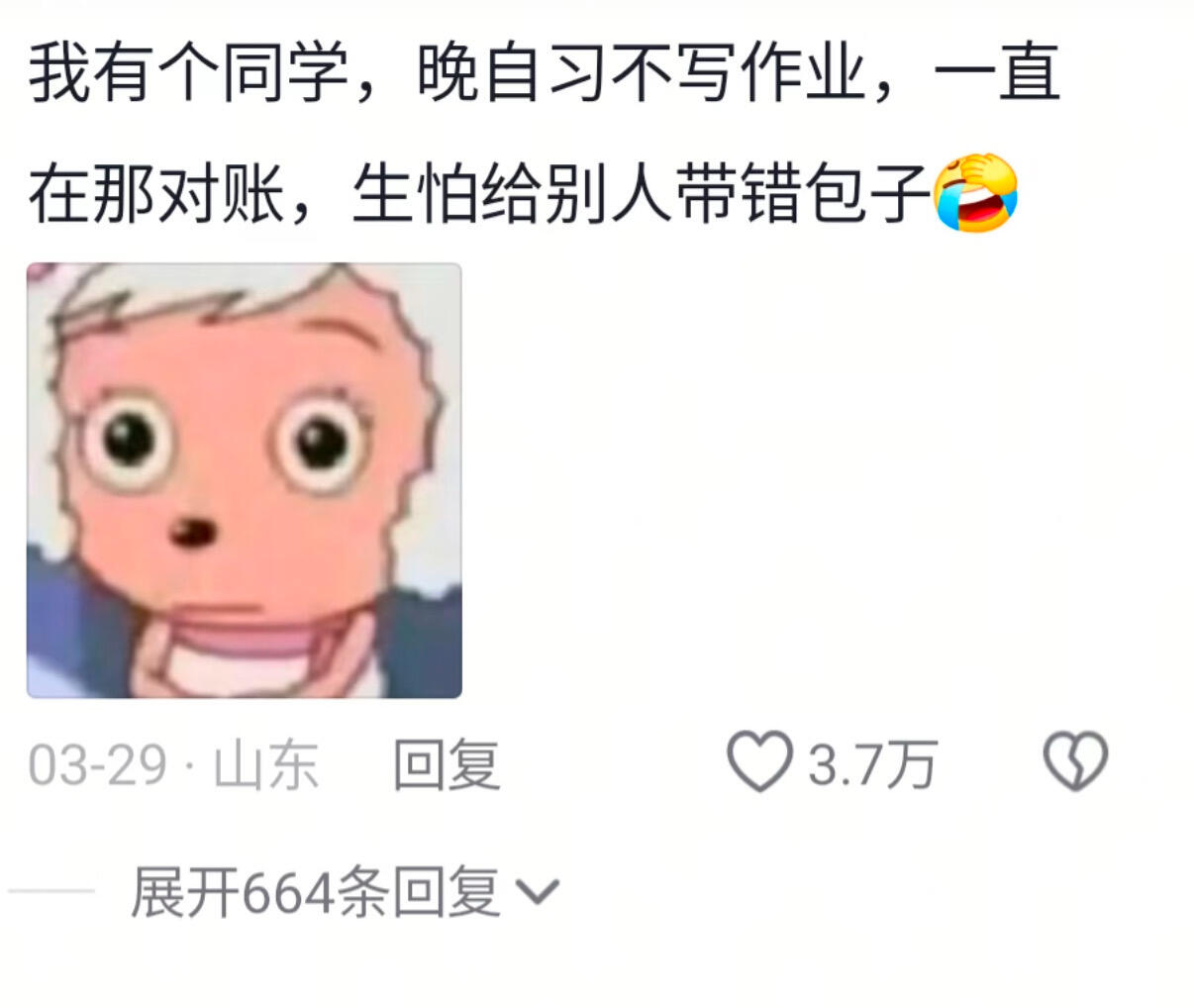 我有个同学,晚自习不写作业,一直在那对账,生怕给别人带错包子