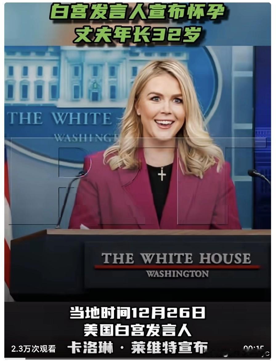 白宫发言人宣布再怀孕 当地时间12月26日,美国白宫发言人卡洛琳·莱维特宣布,她与比自己年长32岁的丈夫即将迎来一名女婴。这对夫妇已育有一子(于2024年出生)。 卡洛琳·莱维特在社交媒体平台上写道:“这是我们所能梦想的最美好的圣诞礼物——一个将于2026年5月出生的女儿。” 28岁的白宫发言人卡洛琳·莱维特在圣诞节宣布怀上二胎女婴的消息引发广泛关注,其与60岁丈夫的32岁年龄差、产后4天返岗的职场表现,以及可能成为白宫首位任内生育的新闻秘书等细节,成为当前舆论焦点。 莱维特于2025年12月26日在社交媒体宣布怀二胎女儿,预产期为2026年5月,称这是“最珍贵的圣诞礼物”。她与大32岁的丈夫尼古拉斯·里西奥于2025年1月结婚,2024年7月已育有一子(此前网传“2025年7月生子”为误)。 特殊身份与职场动态:作为史上最年轻的白宫发言人(28岁),莱维特计划继续任职。若顺利履职,她将成为首位在任期内怀孕的白宫新闻秘书。官方感谢特朗普及幕僚长营造“亲家庭环境”,但未明确产假安排。