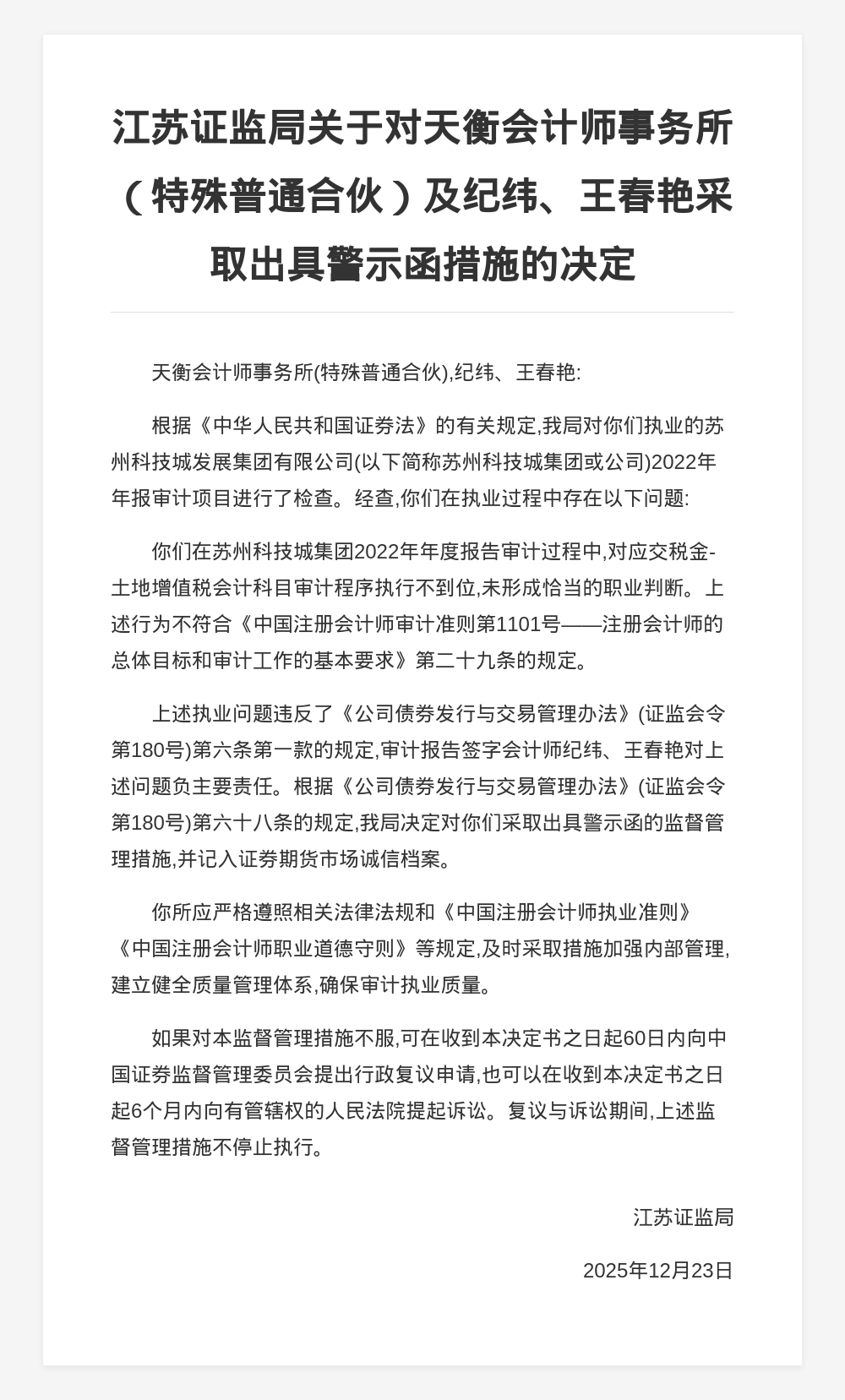 决定书显示,天衡会计师事务所在苏州科技城集团2022年年度报告审计过程中,对应交税金-土地增值税会计科目审计程序执行不到位,未形成恰当的职业判断。