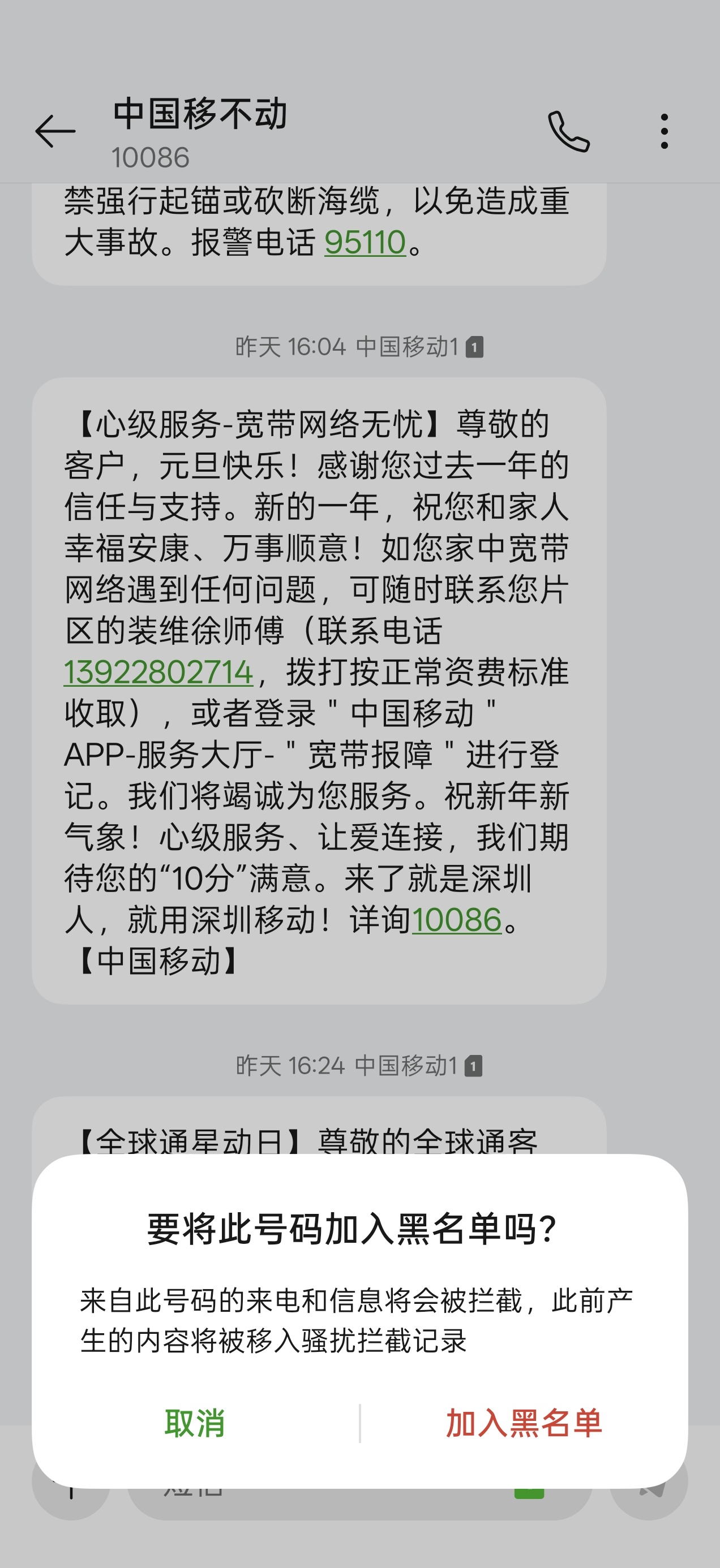 我准备把中国移动的短信拉黑了。已经没有什么有价值的信息,全特么是各种广告,太烦人了。