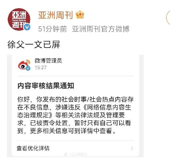 看到亚洲周刊的动态,心里竟添了几分感慨。其发布的徐父一文,转眼就被屏蔽,只留下一纸内容审核结果通知,寥寥数语说涉不良信息、违反规定,具体缘由却半点未提。 亚洲周刊本是传递信息的媒体,如今发文却遭这般处置,连公之于众的机会都没有,只剩发布者自己可见。想来媒体发声本就该是为大众传递不同声音,可如今这般受限,普通人想透过文字了解事情全貌,反倒成了难事。 不知这篇被屏的文字里,藏着怎样的内情,也盼着后续能有清晰的说法,别让真相被轻飘飘的审核通知盖过。