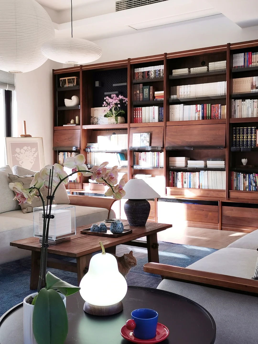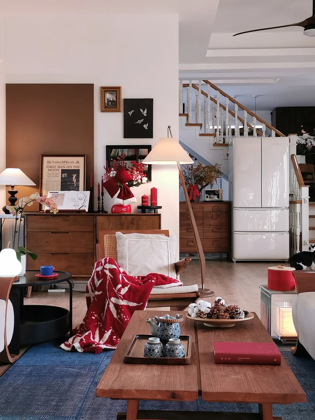 硬装基础软装就不基础,软装我们选择的是有特色的产品,如弧形扶手的沙发、有老物感的柚木茶几、喜庆复古的地毯…