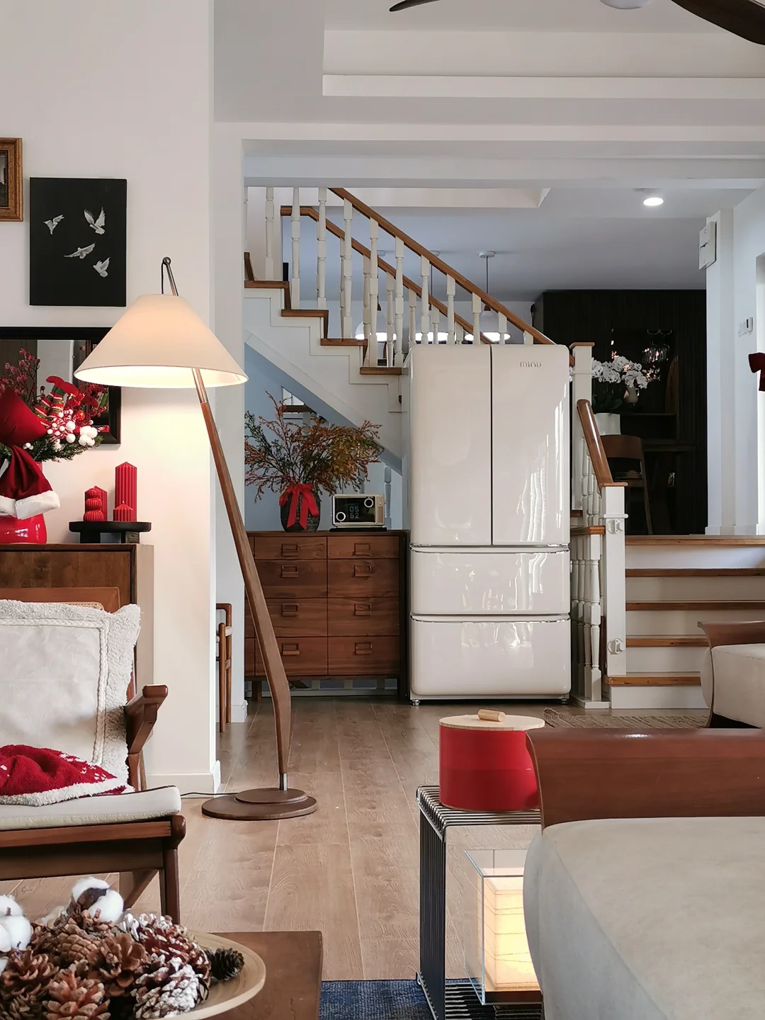 除了软装,电器也是精挑细选,如楼梯旁的小吉复古冰箱,一眼看到就巨喜欢。跟传统直线感的冰箱不一样,法式圆弧线条消弭了家电的冷硬,成了空间里温软的装饰。