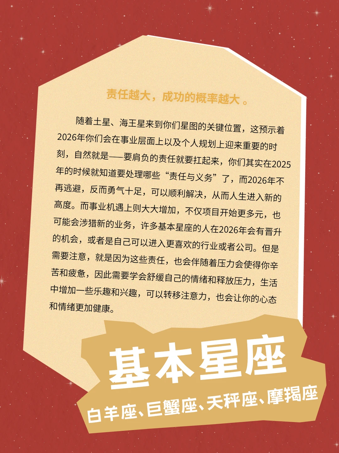 2026年会有诸多重大星体的位移——当然,其实这些位移我们在2025年的时候提前感受到它们对我们个人的影响力。因此从星象趋势来说,2026年依旧是节奏较快的一年,许多人其实也会有一种感受——2025年怎么一眨眼就结束了,那么2026年,这种节奏较快的氛围还会持续。不过这也代表着——机会也会大大增加。