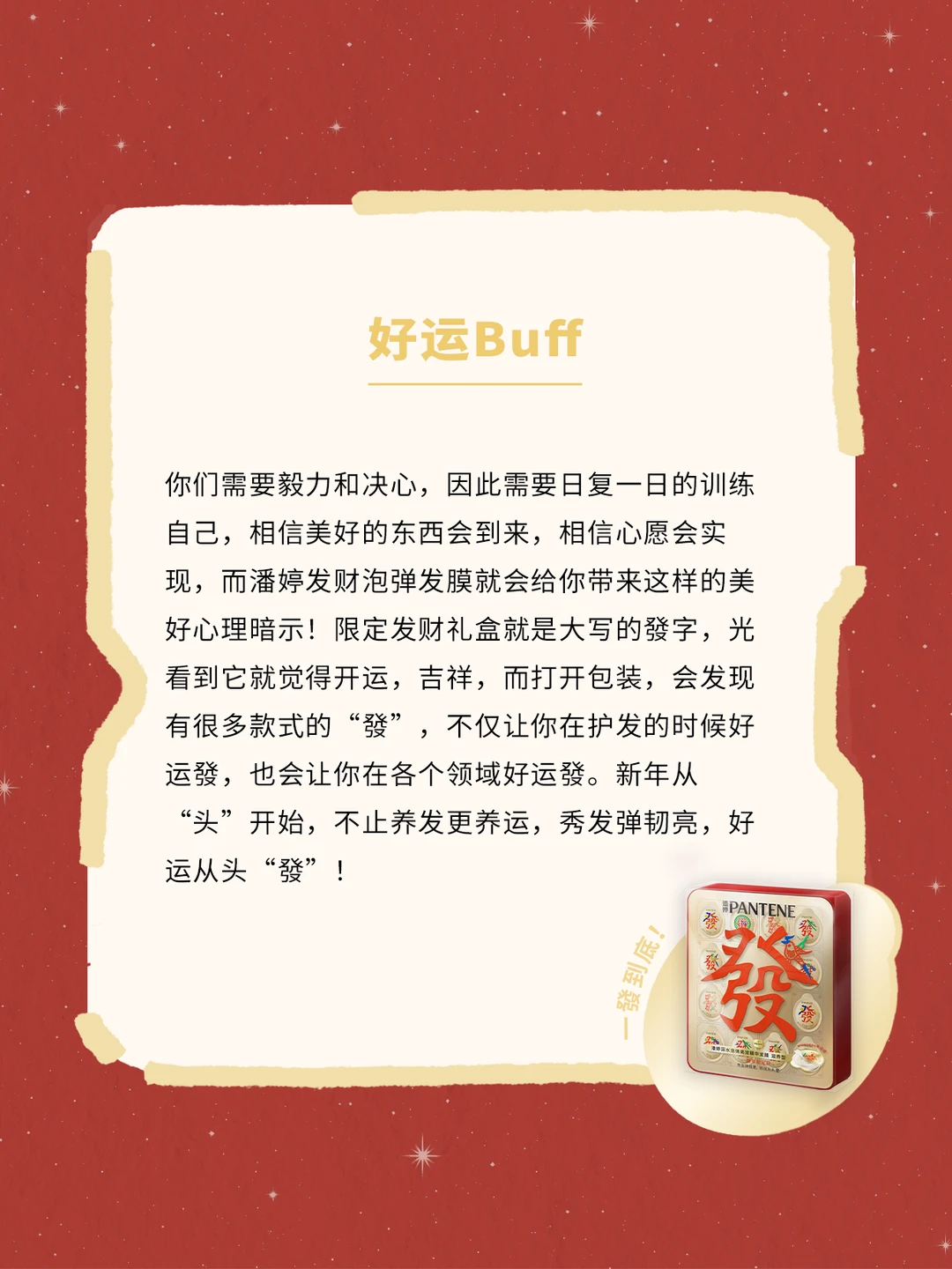 而头发很关键,新的一年从“头”开始,好好呵护自己的头发,让它顺一点,亮一点,自己就会精神一点,运气就会好一点。新一年,潘婷推出了限定的发财泡弹发膜,添加护肤级3A胜肽,可以深入发芯层面修护受损,从内到外根源改善发质。而且限定的发财礼盒包装,撕开每颗发膜都可以看到一句幸运签语,每次护发都有好运發,不止养发也更养运。