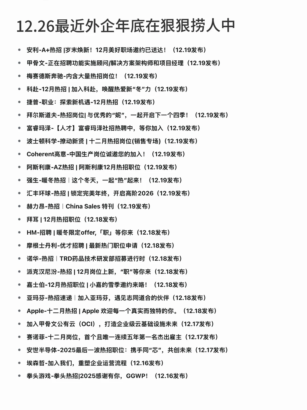 刚整理一些外企新放的hc,年底这个捞人速度,看得出来是真的急 如果想年底换工作、想找稳定+氛围好的,现在是真的很好上车的时间点。 · ▪️年底流程相对精简、竞争压力小;岗位全面,背景和要求也很低 ▪️外企福利好,955双休、年假10-20天起步、对女性友好、还有健身、心理支持... ▪️如果空窗期、跳槽的真的可以在年底前就看看,竞争小 · 坚持日更✊🏻,帮大家在找工作路上顺利拿 offer!