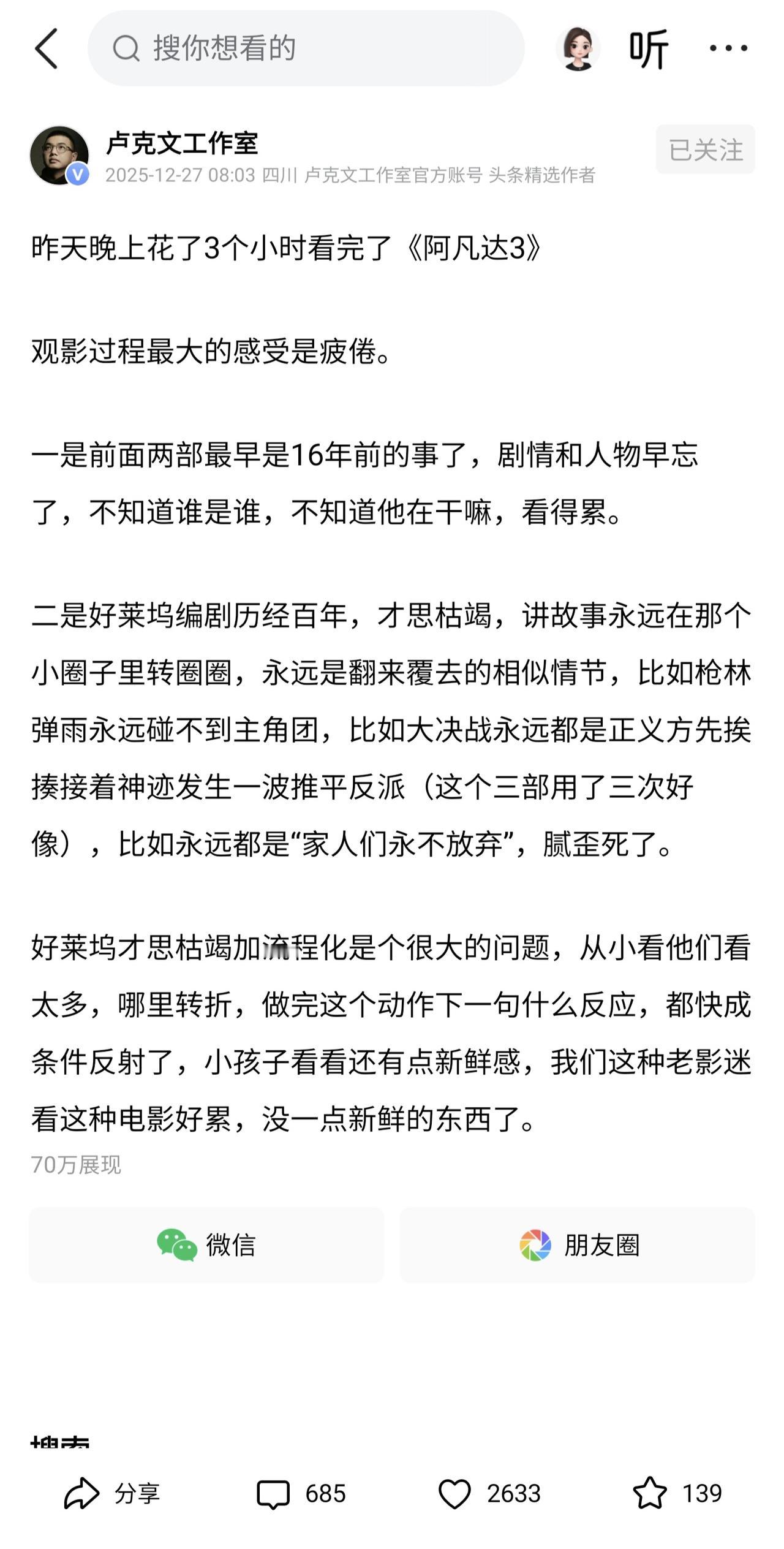 好莱坞电影为什么不行了? 我们不妨按照卢克文老师的经济链逻辑分析一下。我觉得好莱坞不是不会拍有深度的片子了,而是不敢了或者说从商业上不划算了。因为现在的大片,成本动不动几亿美元,资方输不起。 片方算盘打得很精,虽然全球观众口味不一,但“家人们团结打反派”、“视觉轰炸爽一把”这种套路,风险最低,票房最稳。思考?深度?有的时候是票房毒药。 比如我们的贾樟柯导演,拍出来的电影深度和思考都有了,但是票房却比不上商业大片,这就不符合好莱坞的商业逻辑。 所以你看,不是文化输给了商业,是商业直接“绑架”了文化,把文化做成了标准化的快餐,追求绝对的商业安全,结果就是绝对的乏味。卢克文觉得累,是因为我们吃的不是菜,是流水线上精准配比的预制菜。 阿凡达 3