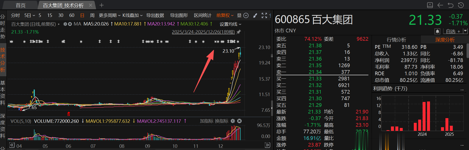 百大集团月内股价累计最大涨幅为145.48%。百大集团12月8日在业绩说明会上表示,公司自2008年起将杭州百货大楼等百货业资产委托给浙江银泰百货有限公司经营管理20年,每年可获得相对稳定的委托经营利润。公司会与合作方银泰百货沟通交流积极应对AI在零售场景的应用。