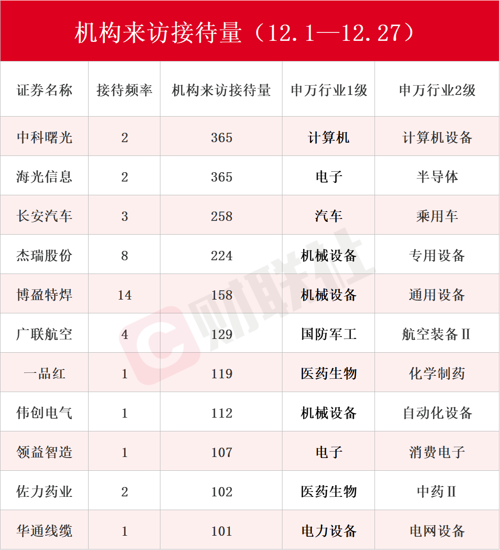 财联社12月27日讯(编辑笠晨)据Choice数据统计,截至发稿,沪深京三市12月(12.1-12.27)共有745家上市公司接受机构调研。具体来看,接待机构调研次数最多的上市公司是博盈特焊达14次;冰轮环境位列第二,接待次数为9次;杰瑞股份、威力传动紧随其后,接待次数分别为8次和7次。具体详见下图: