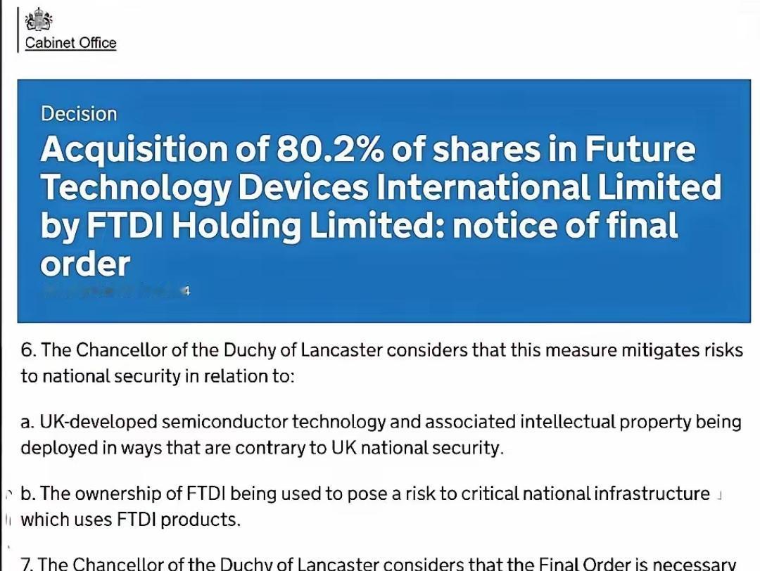 英国又出手了!继荷兰抢夺中资持有的安世半导体之后,伦敦也以“国家安全”为名,逼迫中国建广资产交出其在FTDI公司80.2%的股权。 这哪是什么国家安全审查,分明是明火执仗的强取豪夺! FTDI这家公司是全球USB桥接芯片的头号玩家,占了15%的市场。它的芯片是许多电子设备连接的关键,电动车和医疗设备都离不开它。 建广资产在2021年12月,花了4.14亿美元真金白银买下这八成股份。买卖当时完全合法,钱货两清已经好几年了。 结果英国政府现在出来喊停。他们用的是2022年才生效的新法律,却掉过头来管2021年的老交易。这种“秋后算账”的做法,规矩说变就变。 就在前不久,荷兰政府也用特别法律,把中资拥有的安世半导体给“接管”了过去。中国企业在海外的高科技投资,接二连三被拦下。 USB桥接芯片全球市场规模有近4亿美元,中国是最大市场。英国强制出售,让企业投资受损,使全球产业链的合作信任打了折扣。 总把正常的商业投资说成安全威胁,道理上讲不通。FTDI在英国本土的销售很少,技术也是国际通用标准。这些事实面前,“安全风险”更像是个借口。老这么搞会吓跑国际投资者,对谁都没好处。中国企业以后走出去得想更多办法,但规矩还是应该大家共同遵守。