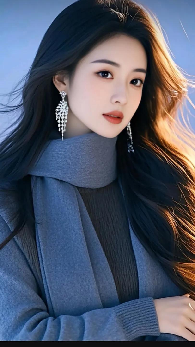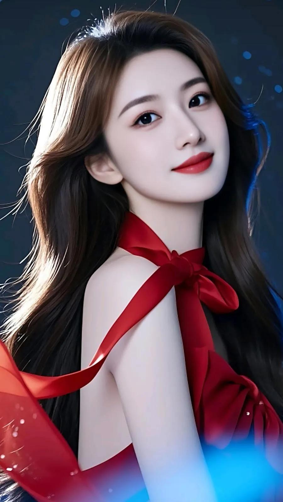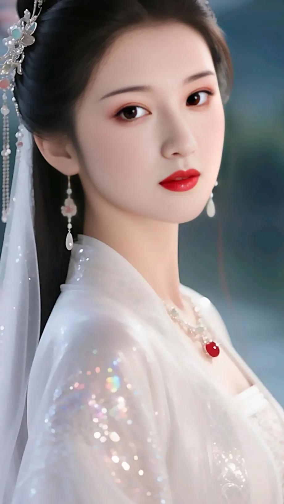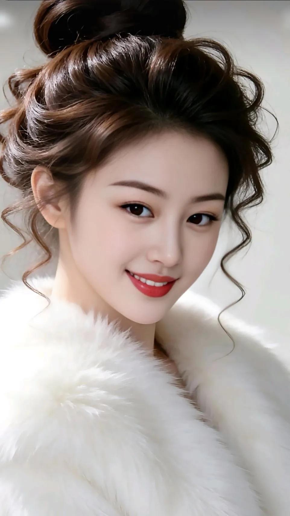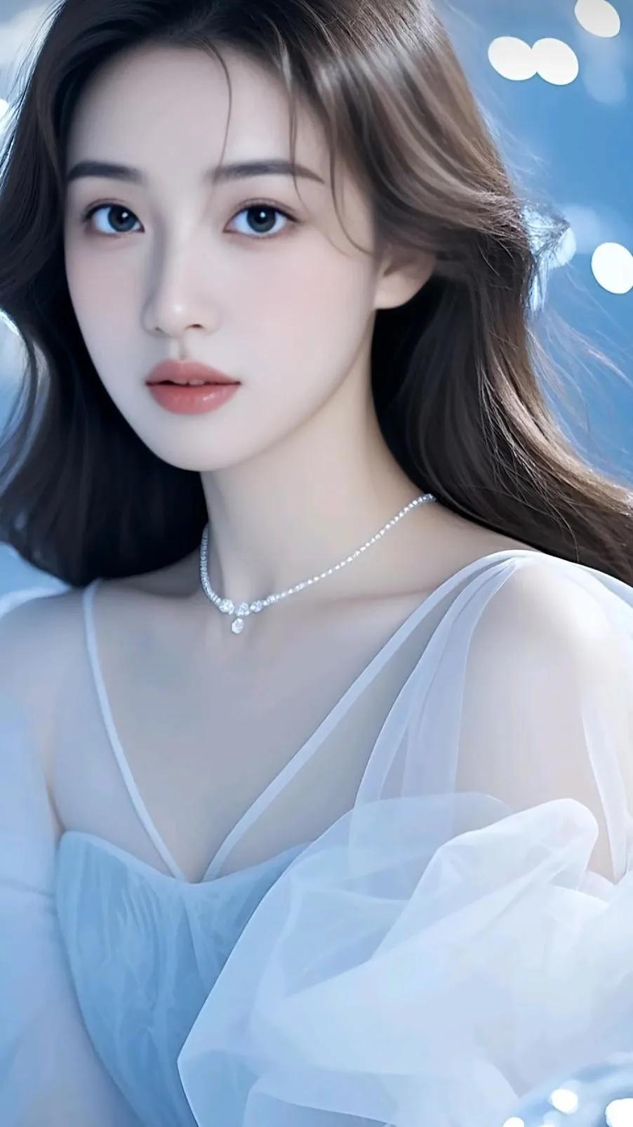 温柔优雅的新娘造型,精致蕾丝婚纱,甜美笑容,梦幻蓝背景。
