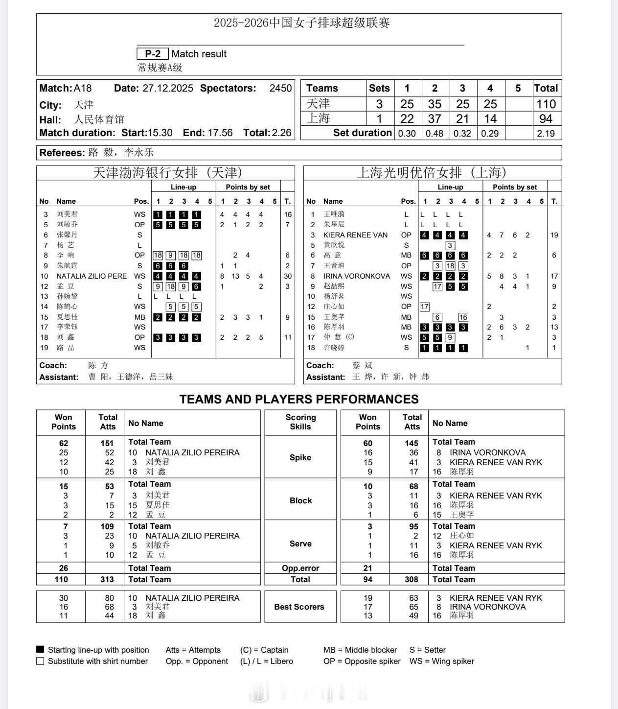 【技术统计】排超第5轮,天津女排3比1上海女排(25-22 35-37 25-21 25-14),娜塔莉娅30分,一传数量和扣球数量均超过全队1/3排超联赛2025-2026中国排球超级联赛 天津女排3比1上海女排