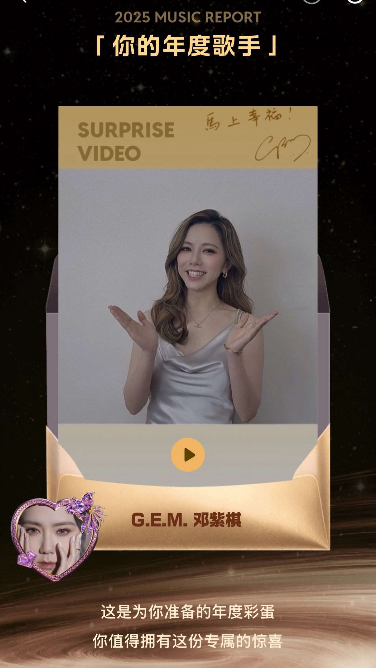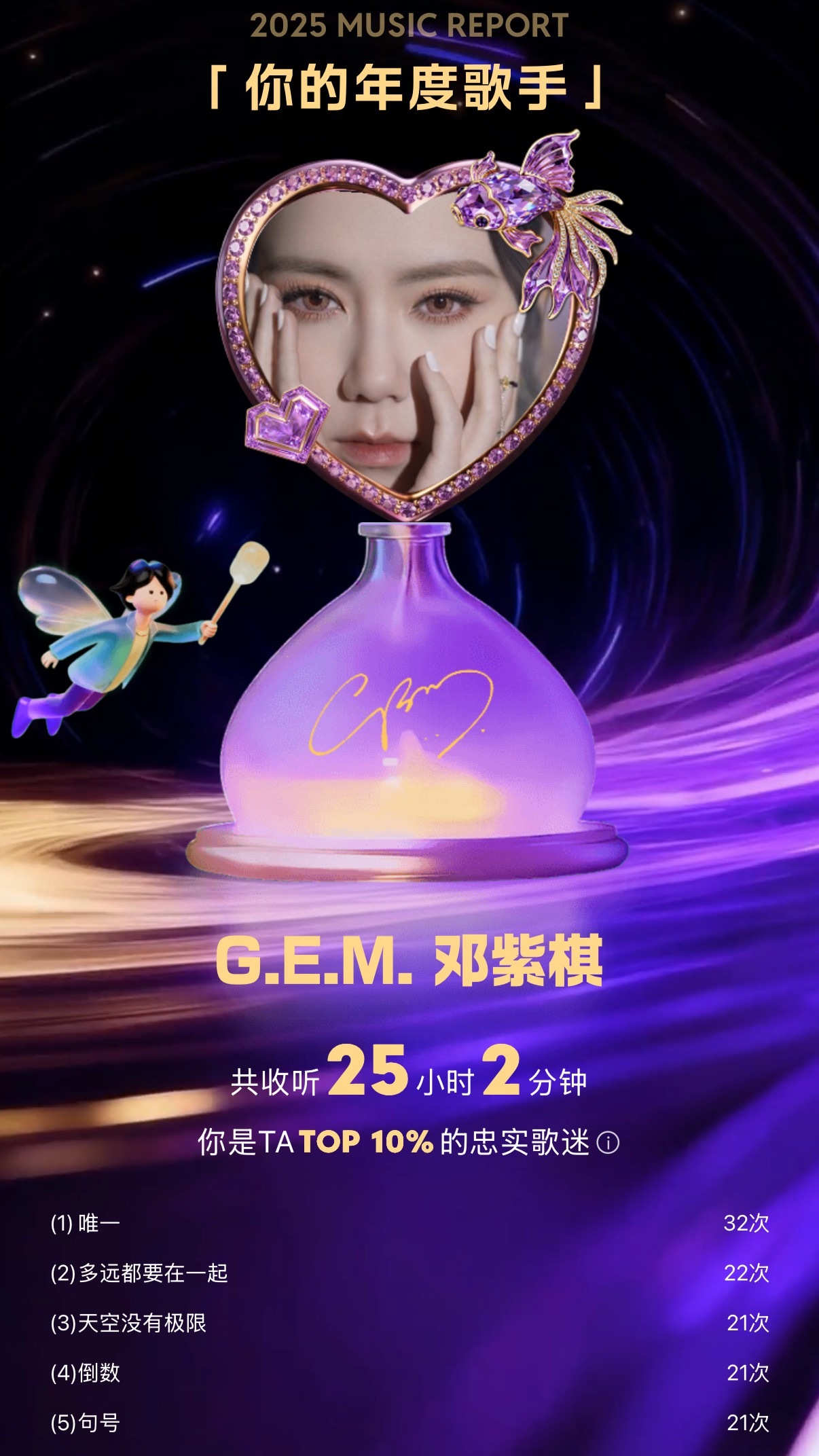 QQ音乐年度报告来了,年度歌手是G.E.M邓紫棋。这一年,耳机里是她,现场也是她。有些歌真的会陪你走过一整年,明年解解巡演结束,准备再看一场。