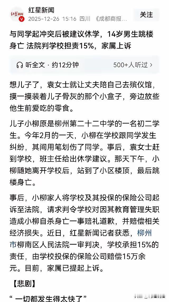 广西柳州,14岁男生患有抽动秽语综合征,上课时同学一直模仿他咳嗽的声音,男生忍无可忍和他打了起来,下课后用笔划伤了同学额头。班主任建议男生休学,家长接他回家后,男生爬到顶楼一跃而下。家长不能接受,起诉校方要求赔偿。 这是一场悲剧的背后,折射出的是我们社会对“理解”与“包容”的缺失。广西柳州的这起事件,犹如一面镜子,映照出青少年的心理健康、家庭教育、学校管理乃至整个社会环境的深层次问题。一个14岁的男孩,因为疾病和孤独,走到了生命的边缘,而我们,又是否真的做好了去理解、去包容他们的那份责任? 故事的起点,是一个患有抽动秽语综合征的男孩。他的世界本就充满了不安和困扰——不自主的抽动、奇怪的声音,让他在同龄人中显得格格不入。更令人心碎的是,同学们的模仿和嘲笑,成为他心中无法承受的重负。学校的环境,本应是成长的土壤,却变成了他孤独的牢笼。 当同学们用模仿取笑他时,他的忍耐似乎到了极限。那一刻,他的愤怒爆发了。或许有人会觉得,他冲动、暴力,难以原谅。但你是否想过,他的背后,是一个渴望被理解、被接纳的心?他用拳头和笔,表达着那份被伤害的无声呐喊。 班主任的建议——休学,像是一把双刃剑。一方面,或许是为了让男孩远离那些伤害,但另一方面,也可能让他更加孤立无援。家长的决定,是出于保护还是无奈?他们带他回家,试图用爱来抚平伤痛,却没想到,悲剧的阴影已经悄然降临。 当男孩爬到顶楼,一跃而下的那一瞬间,令人心碎。生命的脆弱、社会的冷漠、教育的缺失,交织成一幅令人心碎的画面。我们是否反思过:我们身边,是否还有像他一样的“隐形人”?他们的痛苦,是否有人真正去倾听、去理解? 这起事件引发了广泛的社会关注,也让我们不得不直面一些沉重的现实:学校的包容性是否足够?家庭的教育是否到位?社会对特殊群体的理解是否到位?更重要的是,我们是否真正懂得“尊重差异”? 在这个信息爆炸、快节奏的时代,我们常常被各种“成功故事”所包围,忽略了那些“被忽视的角落”。其实,每一个“特殊”孩子背后,都有一份沉甸甸的期待——被理解、被接纳、被爱。而我们,是否真的尽了力? 这个悲剧,不能只停留在指责与愤怒中。它更像是一面镜子,提醒我们:教育,不只是传授知识,更是培养心灵的艺术。学校应成为一个包容的港湾,让每一个孩子都能在这里找到归属感。而家庭,更应成为他们最坚实的后盾,用爱和耐心,陪伴他们走过成长的每一个坎。 我们不能让“误解”变成“悲剧”的导火索。每一个孩子,无论疾病、性格多么不同,都值得被尊重和呵护。社会的温暖,从每一个人的善意开始。从现在起,让我们用更多的理解,去包容那些“不同”的人,让悲剧不再重演。 这起事件,也引发了公众对心理健康教育的呼声。我们需要更多专业的心理辅导,更多对特殊群体的关爱和支持。学校应成为一个安全的空间,而不是“战场”。而家长,也要学会用心倾听孩子的心声,不仅仅是成绩,更是他们内心的苦楚。 生命只有一次,没有人愿意看到如此年轻的生命,就此消逝。我们都应该从中汲取教训:不让“误解”变成“绝望的深渊”。让爱与理解成为我们共同的底线,让每一个孩子都能在阳光下茁壮成长。 这个故事,是一面镜子,也是一个警钟。它呼吁我们每个人:关注那些被忽视的角落,学会用心去理解不同的生命。因为,只有这样,我们的社会才能变得更加温暖、更加包容。 愿那个男孩的生命,不再只是悲剧的符号,而成为我们共同努力的动力。让我们携手,用爱和理解,守护每一份纯真的心灵。抽动症 抽动症小孩