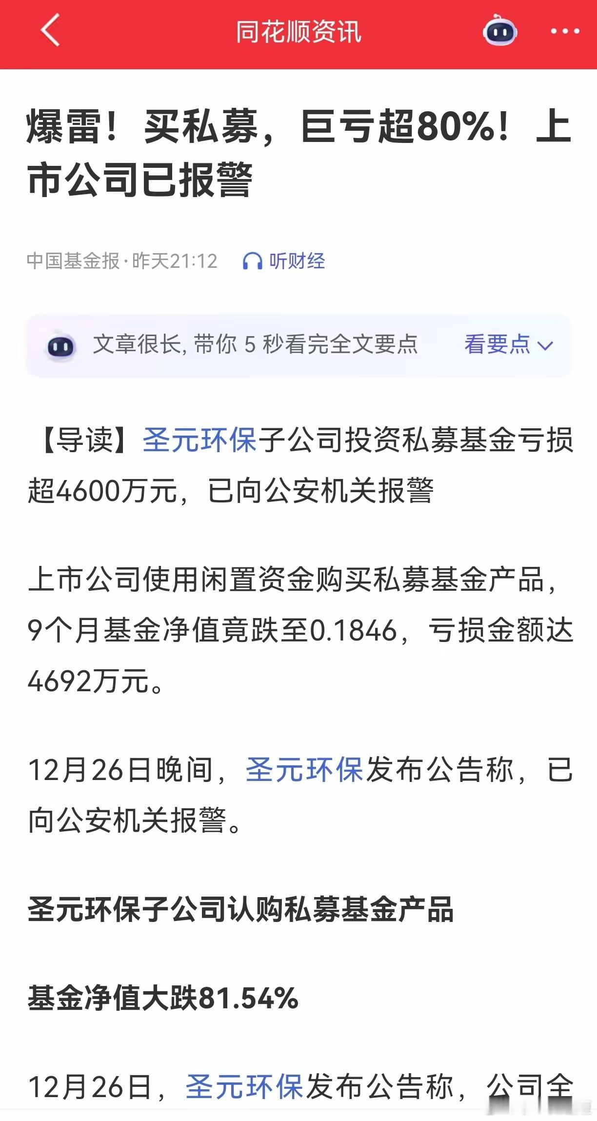 上市公司炒股赔钱了,居然亏损了80%以上,不认输,选择报警,好玩吧。散户赔钱都是自认倒霉,有道是“愿赌服输”,而圣元环保,认购了6000万私募基金,亏损了4692万元,受不了了,想通过报警、诉讼等法律手段挽回损失。各位老铁,看看人家,想想俺们,赔钱了是不是也要通过法律手段捞回来。有人说买的是基金,是投资,和我们炒股不一样。这样说未免肤浅了,俺们散户买股票不也是投资吗?都一样的,不要妄自菲薄。有不少上市公司利用自有资金投资金融产品,各种理财,但是他们不会分红的,有的不仅不分红,还会再圈钱,反正有的是手段。