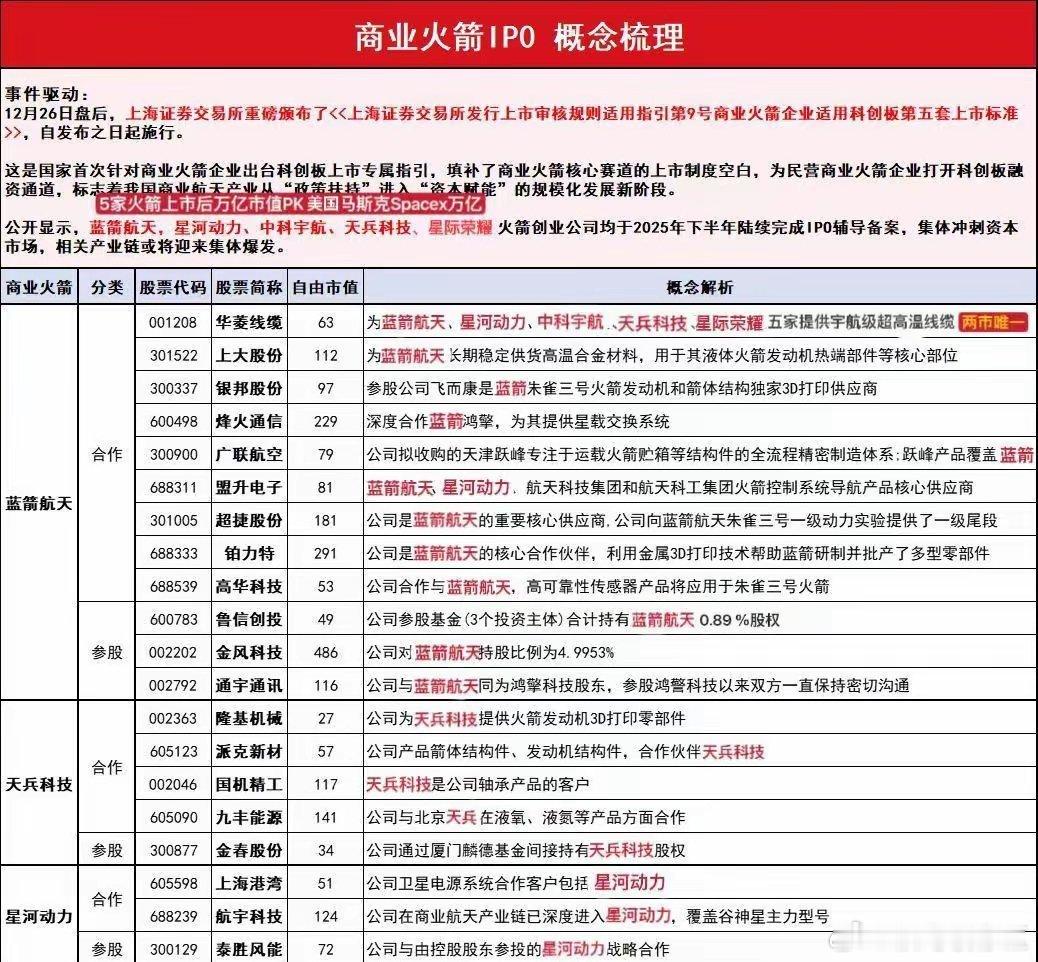 商业航天即将IPO公司参股情况一、参股蓝箭航天1️⃣金风科技(002202.SZ):持有蓝箭航天约8.3%股权,是蓝箭航天A股持股比例最高的战略股东。2️⃣鲁信创投(600783.SH):通过旗下3个参股基金合计持有蓝箭航天约0.89%股权,间接参与蓝箭航天的融资。3️⃣张江高科(600895.SH):通过“张江燧锋基金”间接投资蓝箭航天1.5亿元,为蓝箭航天对接上海产业资源与政策支持。4️⃣斯瑞新材(688102.SH):除为蓝箭航天提供液体火箭发动机推力室内壁产品外,还直接参股蓝箭航天,实现业务与资本的双重绑定。二、参股天兵科技1️⃣航天机电(600151):直接持有天兵科技1.5%股权,是天兵科技的第一大A股股东,同时还为天龙系列火箭提供核心太阳能电池板和电源系统。2️⃣中国卫星(600118):通过航天星图基金间接持有天兵科技约1.2%股权,参与天龙三号卫星组网设计,与天兵科技共同支撑国家低轨卫星部署计划。3️⃣海翔药业(002099):通过寓鑫基金持有天兵科技1.352%股权,是A股第二大间接参股方。4️⃣炬华科技(300360):通过产业基金间接持有天兵科技较高比例股权。5️⃣华测检测(603016):间接参股约0.8%,为商业火箭提供全流程检测服务。6️⃣中天火箭(003009):通过参与的航天产业基金间接持有天兵科技的股份。7️⃣金春股份(300877):间接持有天兵科技约0.27%股权。股票