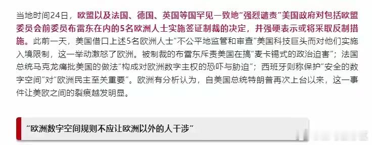 失控了!中方反制美国对台军售 ,法德英罕见谴责美国,中欧要联手果然如何得到的,最终还是要还回去。就在当下所有人都以为,当下的欧盟早就成为了灭国后花园,不管美国如何出手,欧盟就只有两个字,那就是“照办”。结果没想到的是,美国这边刚制裁,欧盟这边却突然开始强硬起来了。不仅英法德罕见统一共识直接对美国发出强烈谴责,更为重要的是,更是表示,要对美国采取反制措施。欧盟这是要开始对美国出手了吗?而就在欧盟强硬的同时,中国也不遑多让,甚至就连尼日尔都对等反制了,美国霸权要破产了吗?法德英罕见联手本以为当下就只有中国在对美国出手,结果没想到,一向只对中国强硬的欧盟也开始对美国强硬了,更为重要的是,当下就连非洲都开始动手了。真可谓是,树倒猢狲散,破鼓万人捶!就在特朗普以为一切都在自己的掌握之中的时候,没想到,自己最放心的地方,现在反而开始不安分了。就在当地时间12月24日的时候,欧盟以及法国、英国和德国罕见地达成了一致,那就是对美国发出强烈谴责。核心就是,美国对欧盟委员会的五名欧洲人士进行了签证制裁,而且还表示要采取制裁措施。因为美国觉得,这五名欧洲人士对美国科技巨头企业采取了不公平的监管和审查,所以必须强力出手。这也就是说,美国企业到欧盟赚钱,那是给欧盟脸面,欧盟居然敢调查甚至还要监管,这不是打美国的脸么,所以必须得制裁。而欧盟就直接没法忍了,毕竟当下不管是法国的大游行,还是英国的大乱斗,其实很大的一部分原因就是因为美国的科技公司掌握了舆论话语权,导致当下的欧盟总是陷入到两难的境地。现在美国不仅要对欧盟加征关税,而且还要欧盟对美国加大投资力度,必须达到7500亿美元,并且在2035年之前,国防支出必须达到GDP的5%。可以说,美国这是直接没把欧盟放在眼里,毕竟中国的国防支出还不到2%,而欧盟在经济下行期,却要将国防支出提高到5%,这妥妥地是逼着欧盟内斗的架势。更为重要的是,美国科技企业在欧盟大赚特赚,但是却要求欧盟不得审查和监管,这不就是欺负老实人么。当下英法德能够达成一致,可以说,实属难得。毕竟一直以来,大家都有自己的小打算。英国想当美国和欧盟的桥梁,而德国更不想激怒美国,因为德国的汽车还指望美国赚钱呢。现在好了,三个国家都达成了共识,这也就意味着,当下的欧盟对于美国早就已经不耐烦了。而且当下还只是开始,毕竟欧盟接下来的日子只会越来越难过,这个时候欧盟必将右转。甚至在欧盟国家内部的调查中,谁是欧盟最大的挑战,美国居然排在中国之前。这就能够理解当下欧盟行为了,毕竟谁能比得上美国霸道呢?而对于美国来说,可就危险了。一个国家出手,威胁不大,但是一群国家出手,那美国还能招架得住吗?就在欧盟对美国发出警告的同时,中国更是直接出手,对美国的20家军工企业和个人进行制裁。而这对于美国来说,显然是不能接受的,毕竟当下美国的企业还指望中国的稀土来发展呢。要是中国对等反制而美国没有反应,那是不是在其他国家眼里,美国已经不是那个高不可攀的国家了呢?这也就有了当下我们看到的,尼日尔直接对美国对等反制。既然你不给尼日尔签证,那尼日尔也不给你美国签证,大家平等对待。可以说,这是历史上的首次。要是在以前,这些国家的第一步肯定是飞往美国,给特朗普送礼,而当下居然对等反制,这不就是美国霸权旁落的象征吗?而且只要出手的国家足够多,那将会有更多的国家出手,毕竟神是不能流血的,只要你流血,那就意味着你已经失去了霸权,而其他国家出手,只要你按不住。那就意味着,接下来各国都会上去咬一口,直到美国彻底筋疲力尽。只能说,当下各国的反制看似都是一小步,但是这确是反对美国的一大步,只要走出了这一步,那美国就成为了少数。只能说,时代变了,美国想安然无恙的退回去,真有那么容易吗?