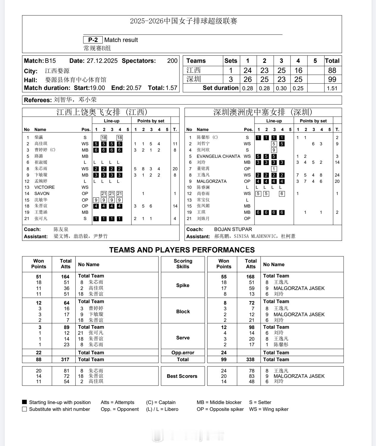 【技术统计】排超联赛第5轮,江西女排1比3深圳女排(24-26 23-25 25-23 16-25)排超联赛2025-2026中国排球超级联赛