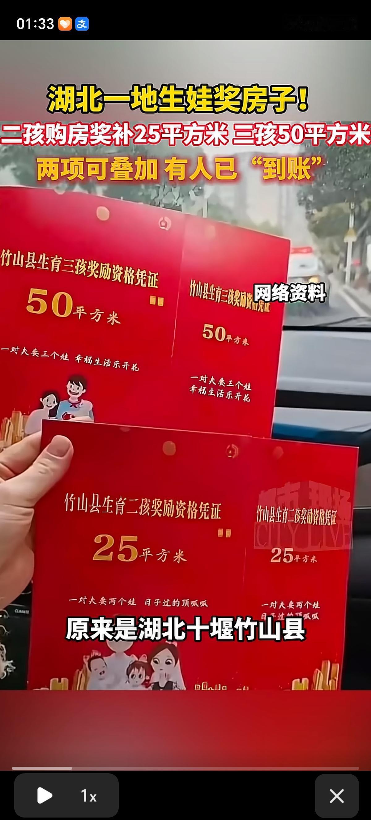 生三孩奖补75平米房子,你生不生呢?湖北十堰竹山县放大招了,生二孩购房补25平米,生3孩补贴50平米,可以叠加,目前已有家庭成功申领该福利。 咱先说说想领这个奖补得满足啥条件:首先得是2021年6月1日到2025年12月31日之间生的二孩或三孩,夫妻里得有一方是竹山户口,而且得在竹山城区指定的楼盘买新建的商品房才行。 再说说这奖补咋发的,不是直接给房子,是把奖补的面积折成现金抵扣买房的钱,这部分钱政府和房企各出一半。按当地房价算下来,二孩的25平方米差不多能抵11.25万元,三孩的50平方米约22.5万元,这可是真金白银的优惠啊。 还有额外福利呢,生三孩的家庭不光能享购房奖补,还能领1万元的一次性奖励,孩子满3岁前,每个月能拿500元育儿补贴;如果孩子进了备案的托育机构,每月还能再补300元,养娃的压力直接小了不少。 家人们有心动的没,今年补生第几胎?