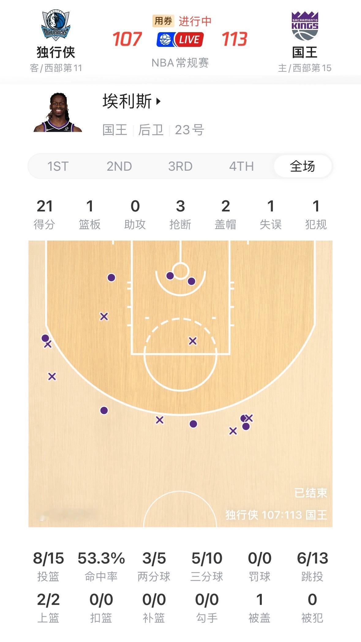 艾利斯首发出战32分钟,15投8中,三分10中5,得到21分3抢断2盖帽1失误。