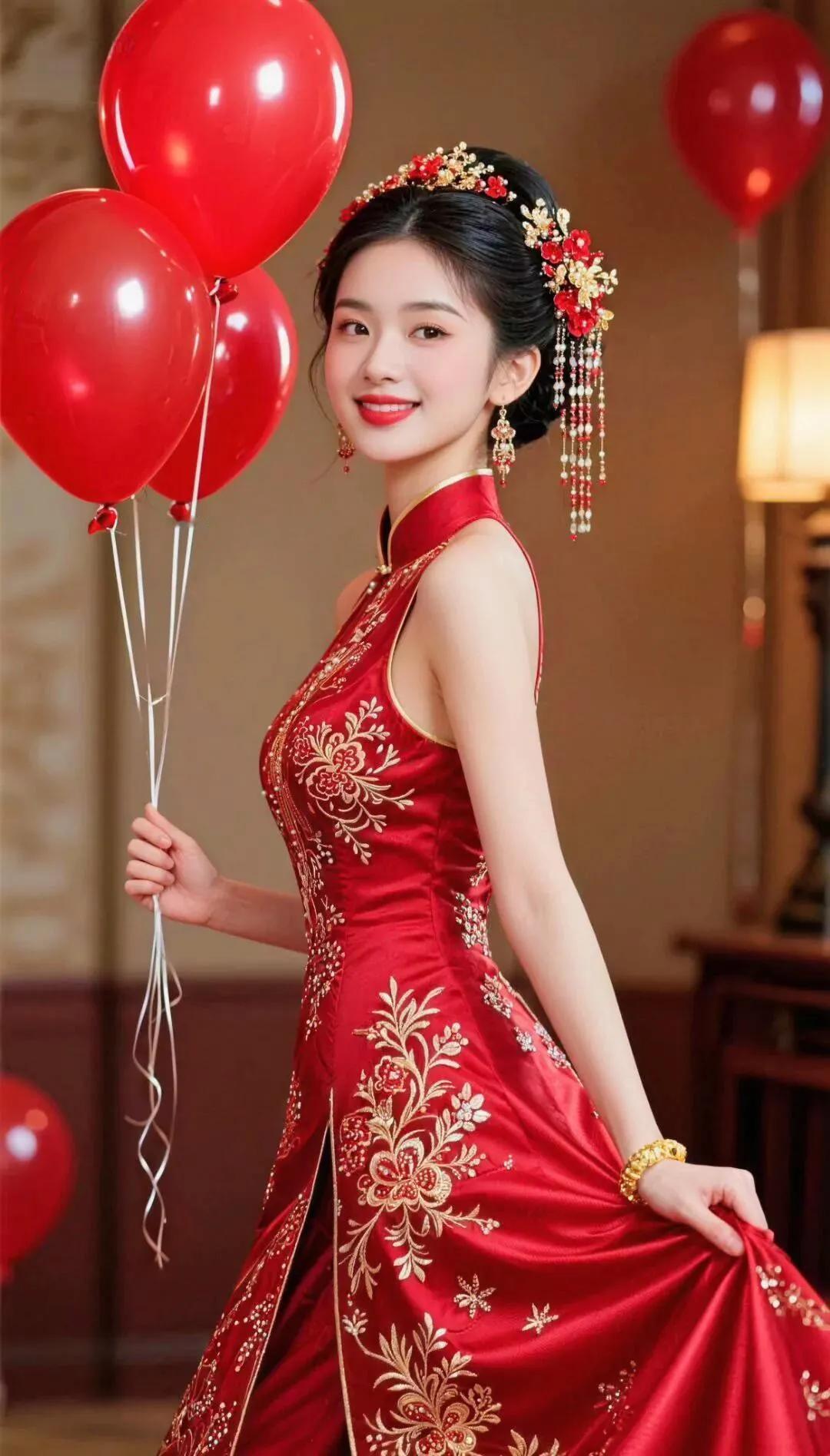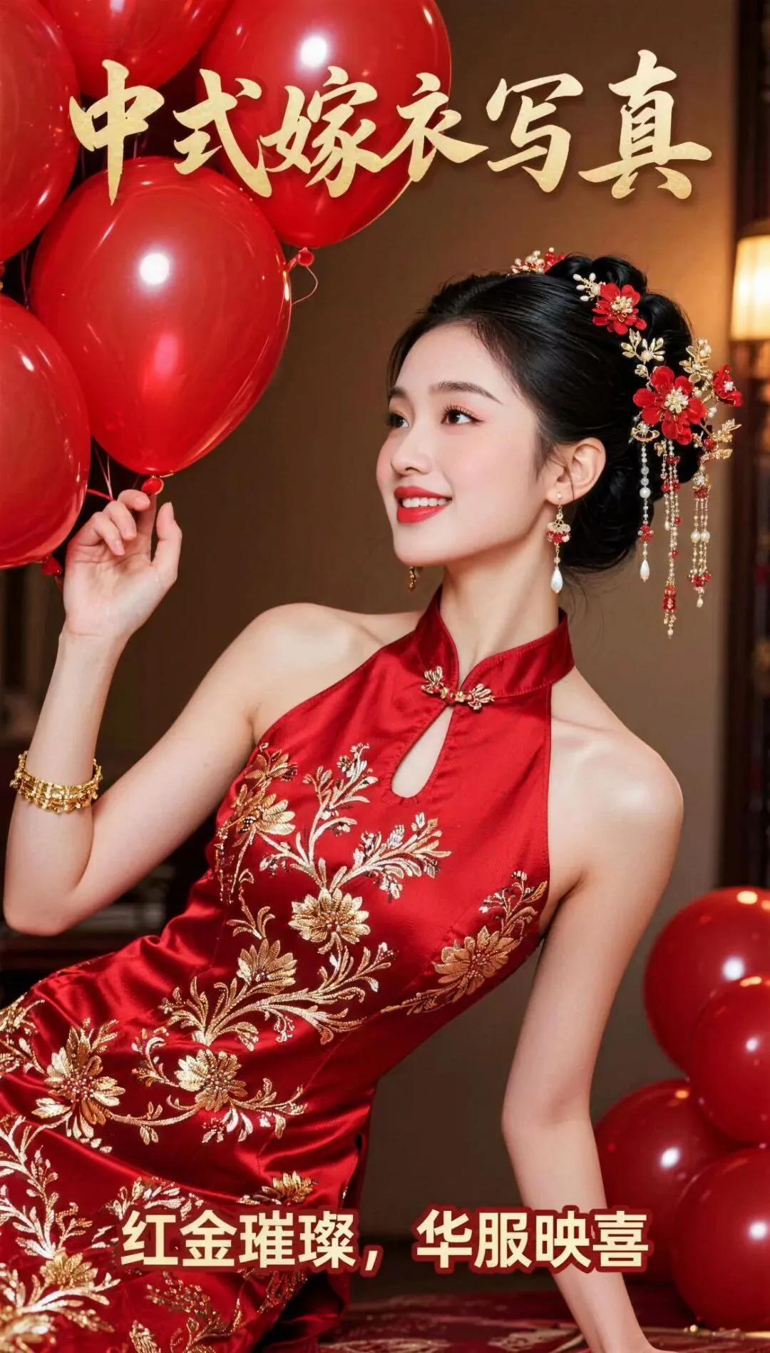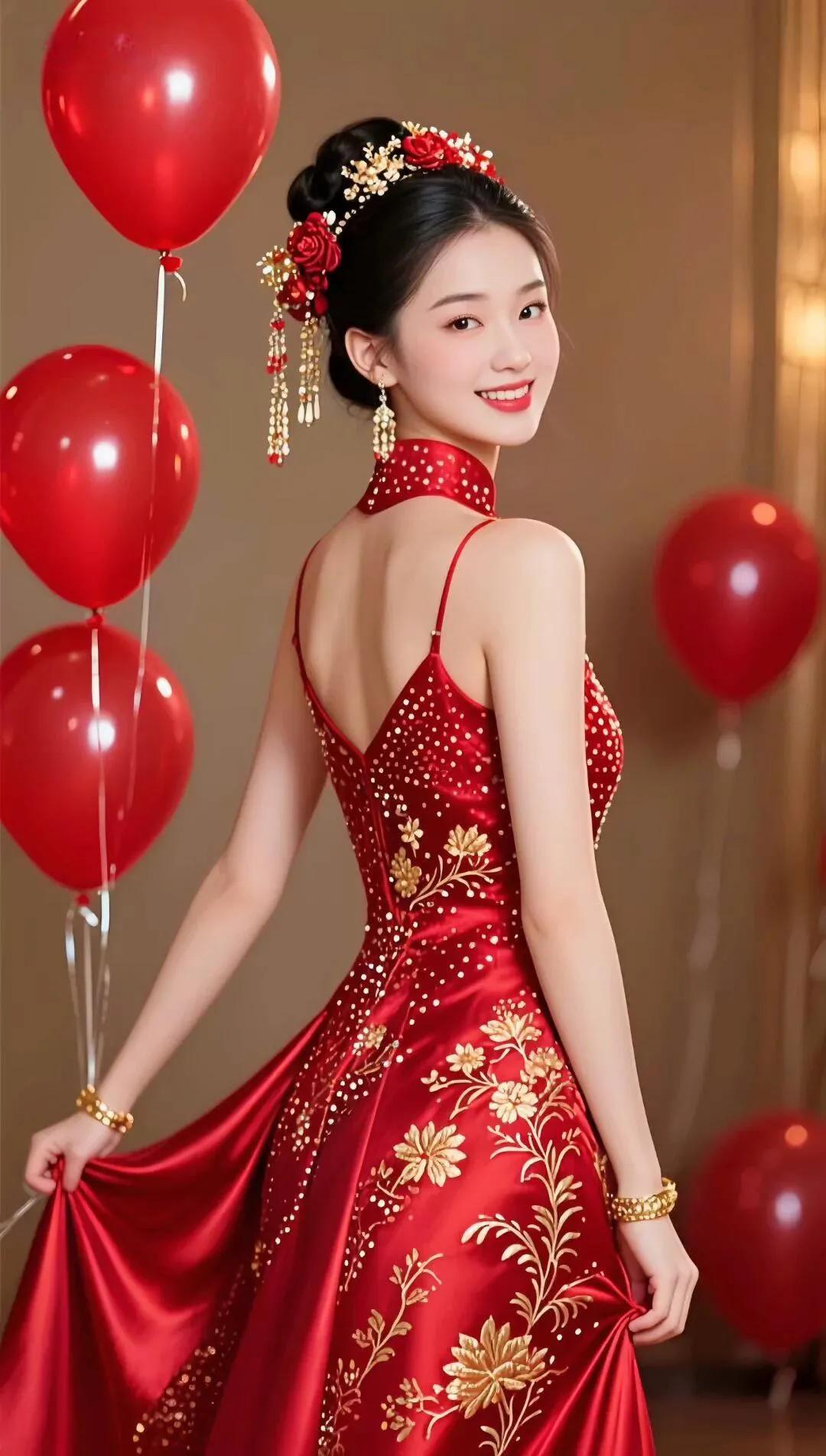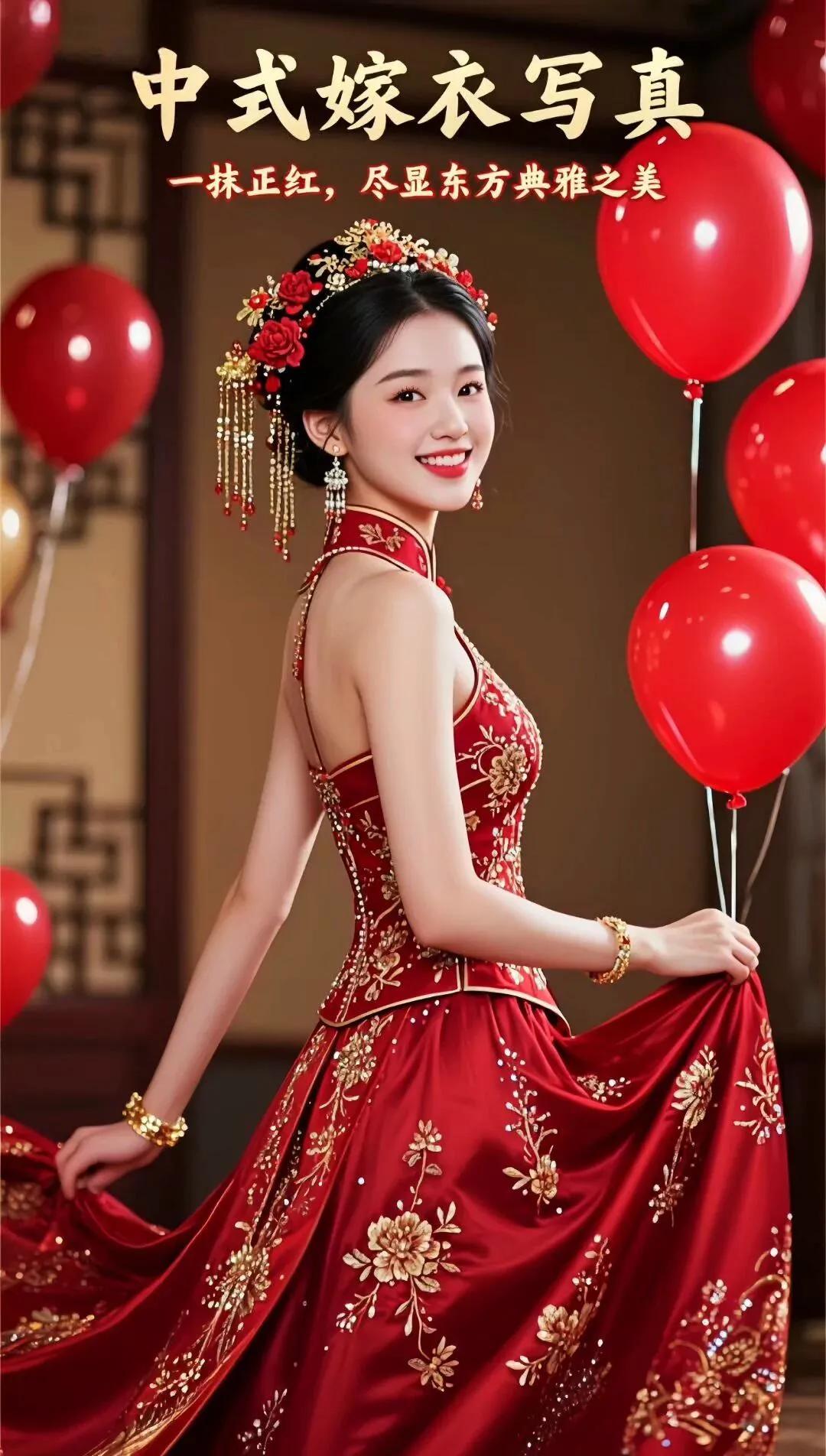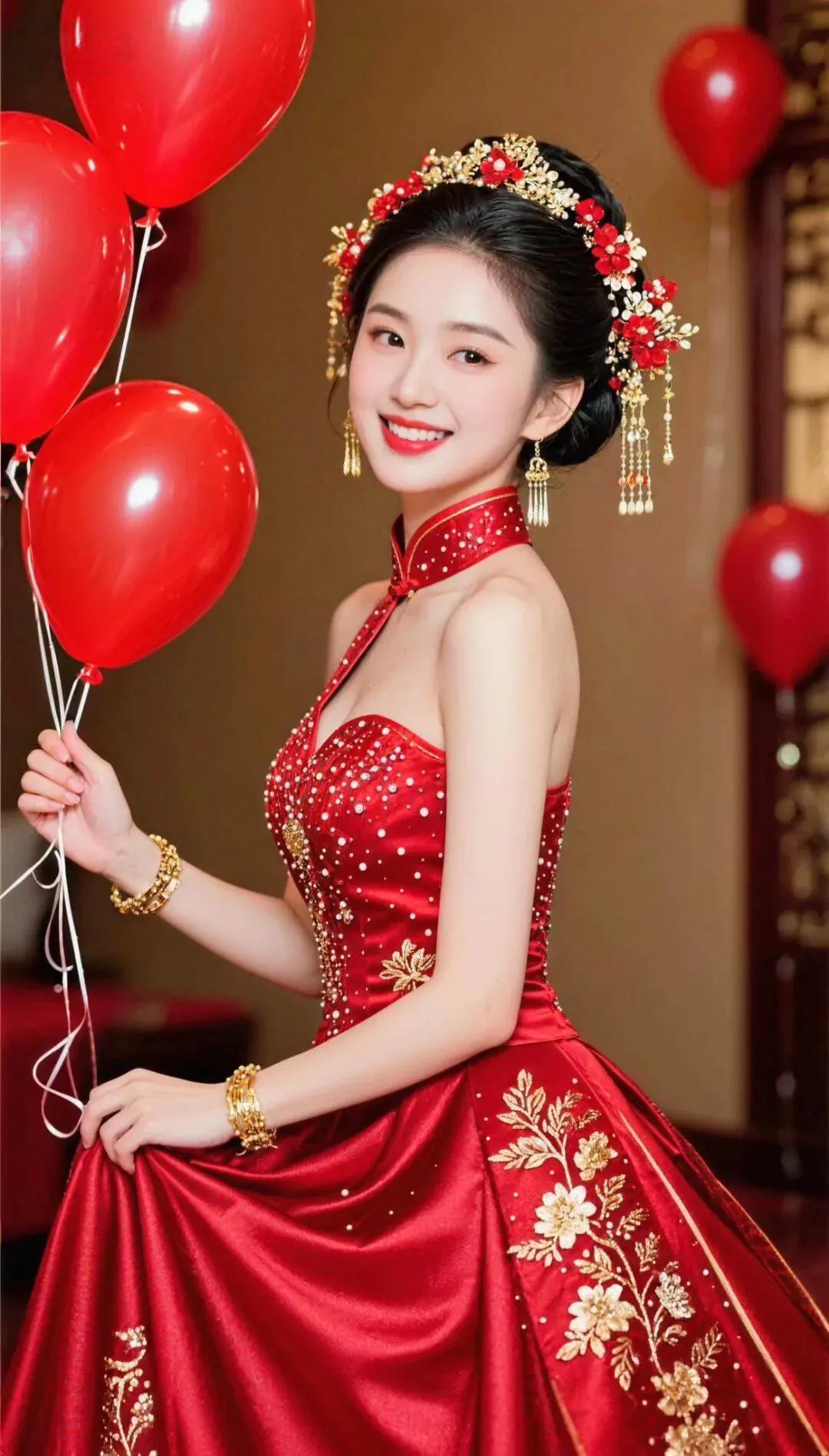 红衣佳人,花环点缀,笑靥如花,喜庆氛围
