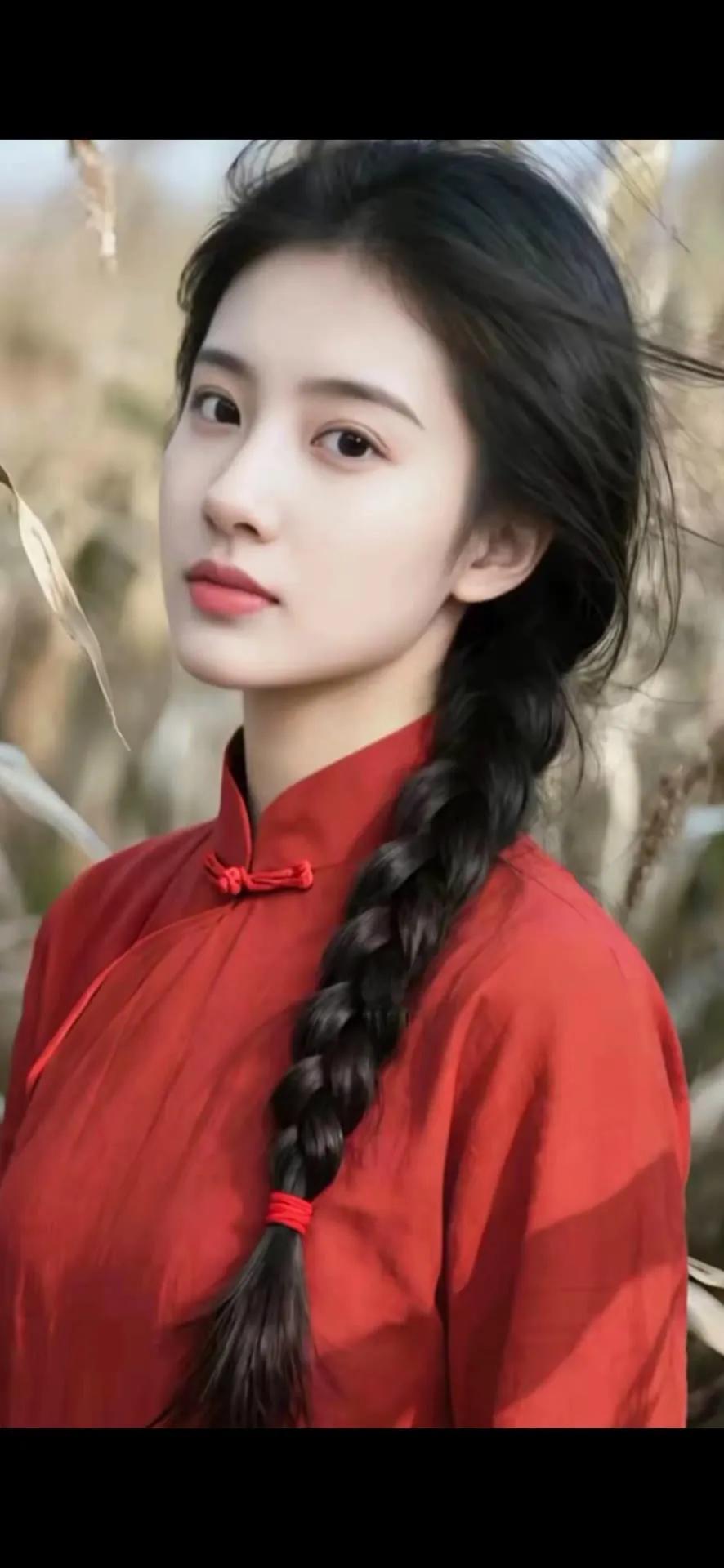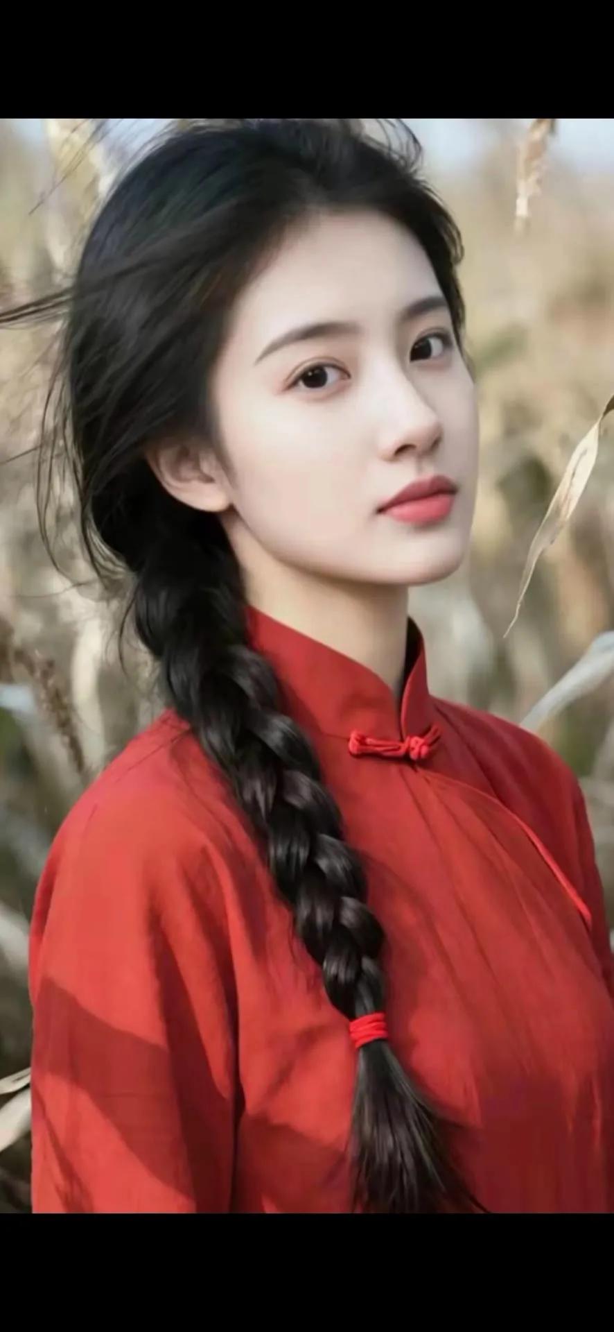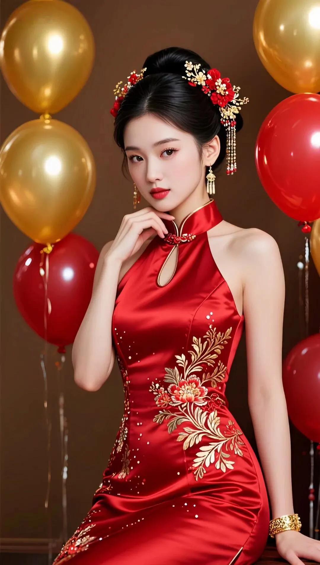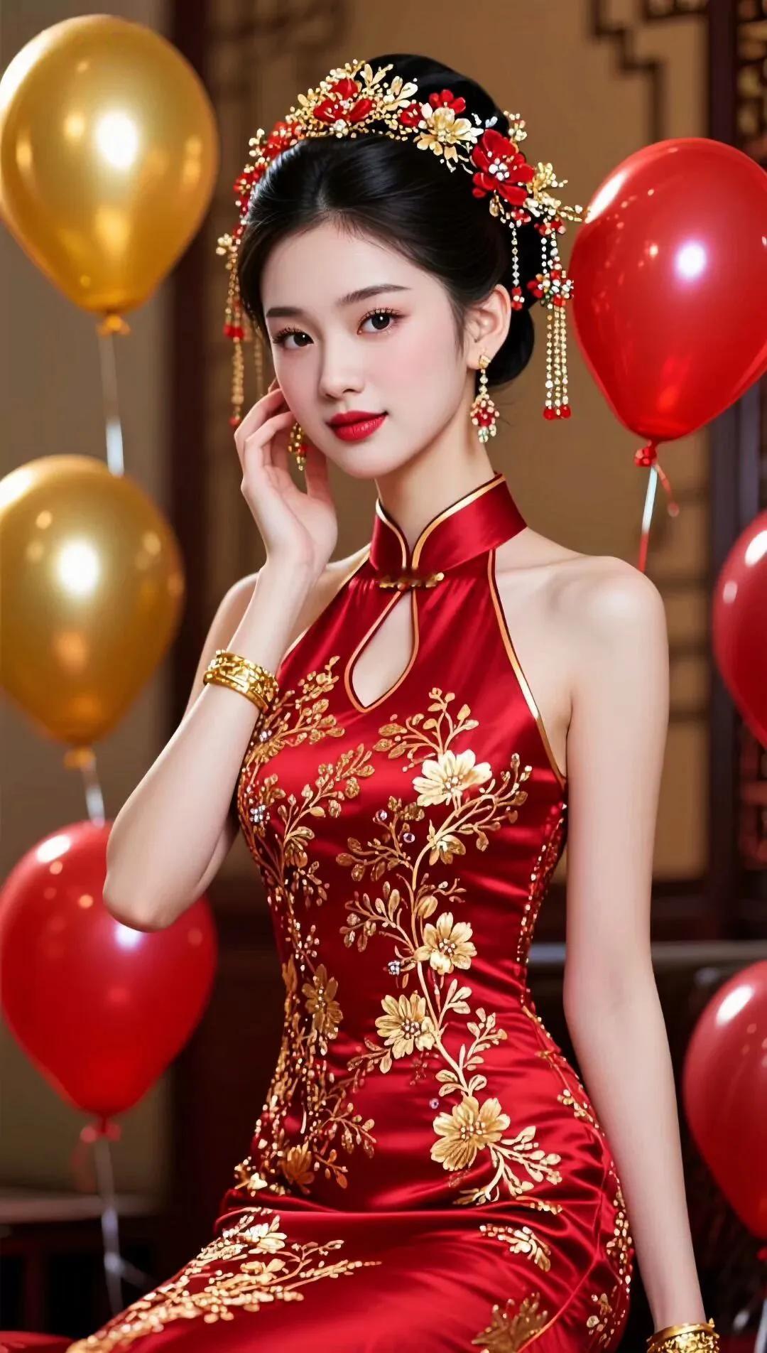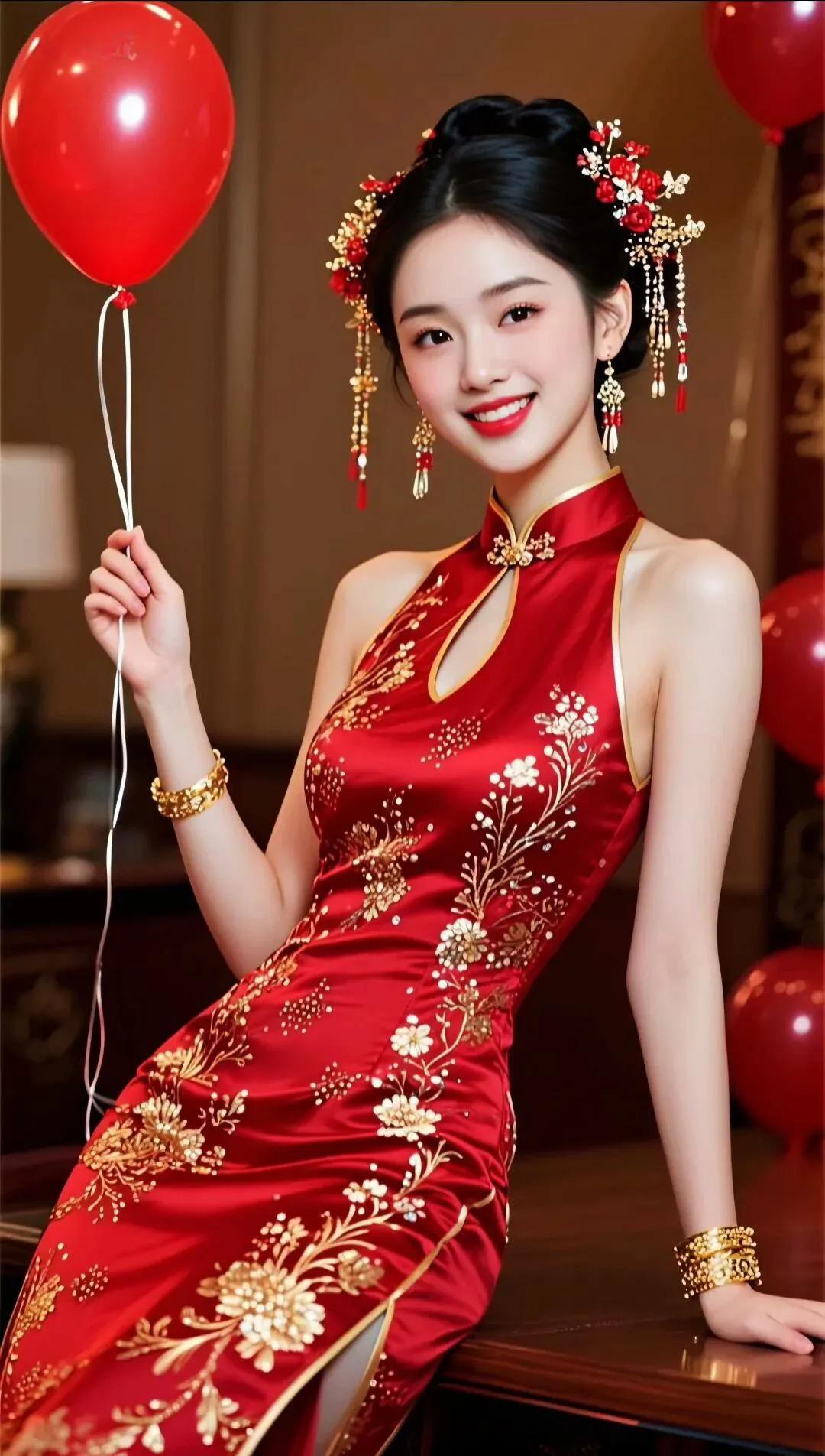 红衣佳人,花环点缀,笑靥如花,喜庆氛围