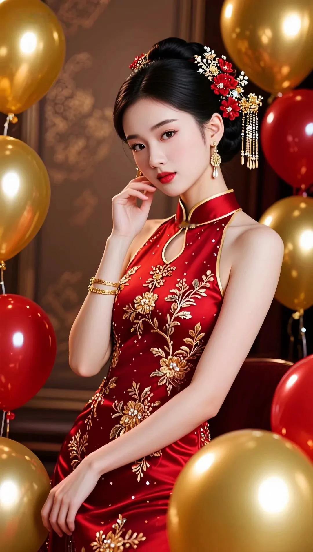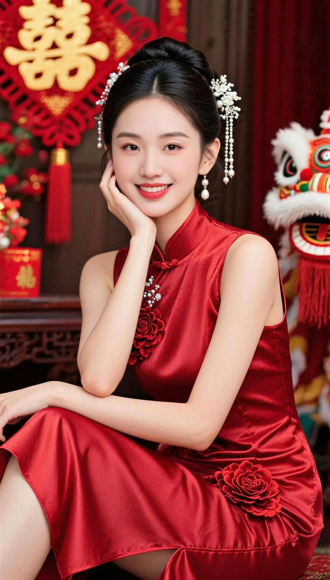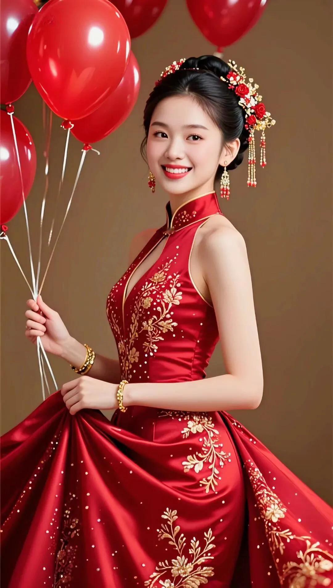 红白相间的旗袍,搭配精致的盘发和花饰,尽显东方古典美!