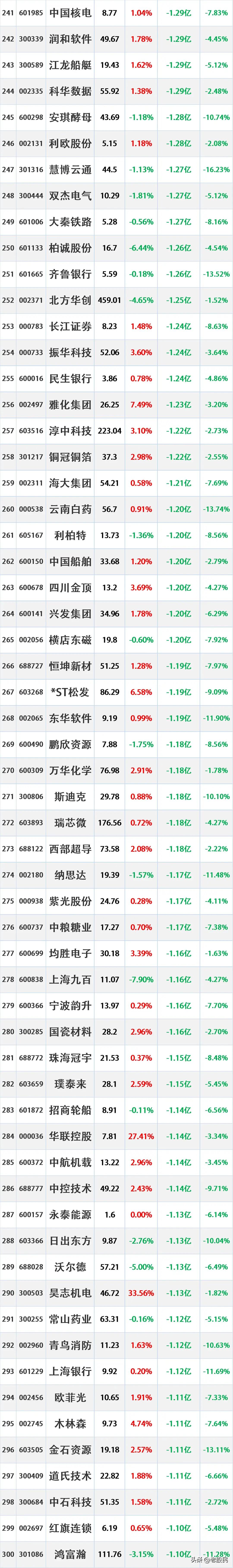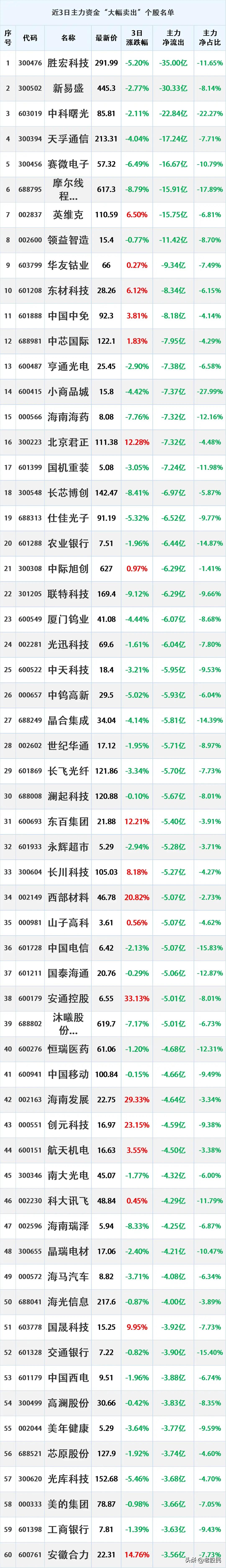 近三日,主力资金大幅流出的股票名单。 资金流出是指在一定时期内(如一天、一周等),主动卖出某只股票的资金量大于主动买入该股票的资金量。主动卖出是指投资者以买方的报价直接成交,显示出投资者对该股票的消极持有或抛售意愿。