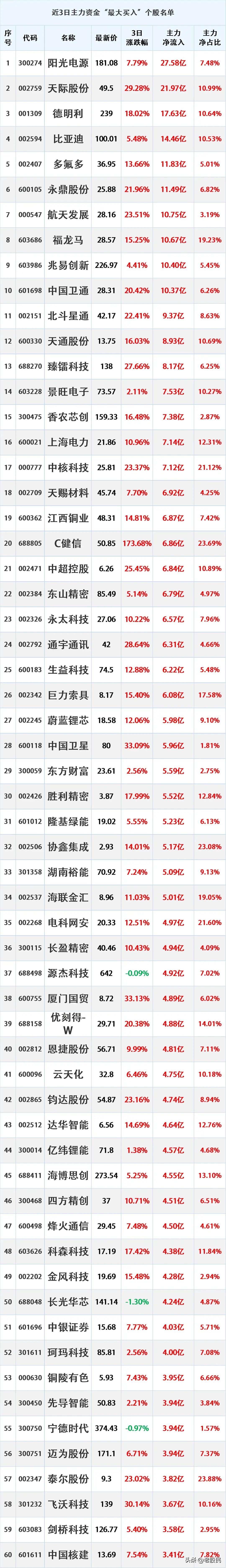 近三日,主力资金大幅流入的股票名单。 资金流入是指在一定时期内(如一天、一周等),主动买入某只股票的资金量大于主动卖出该股票的资金量。主动买入是指投资者以卖方的报价直接成交,显示出投资者对该股票的积极购买意愿。