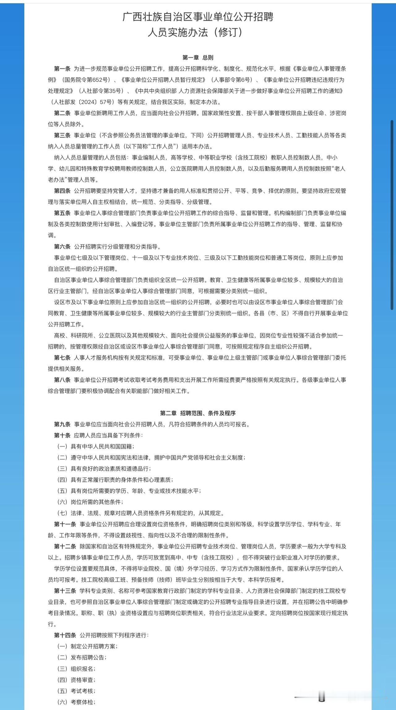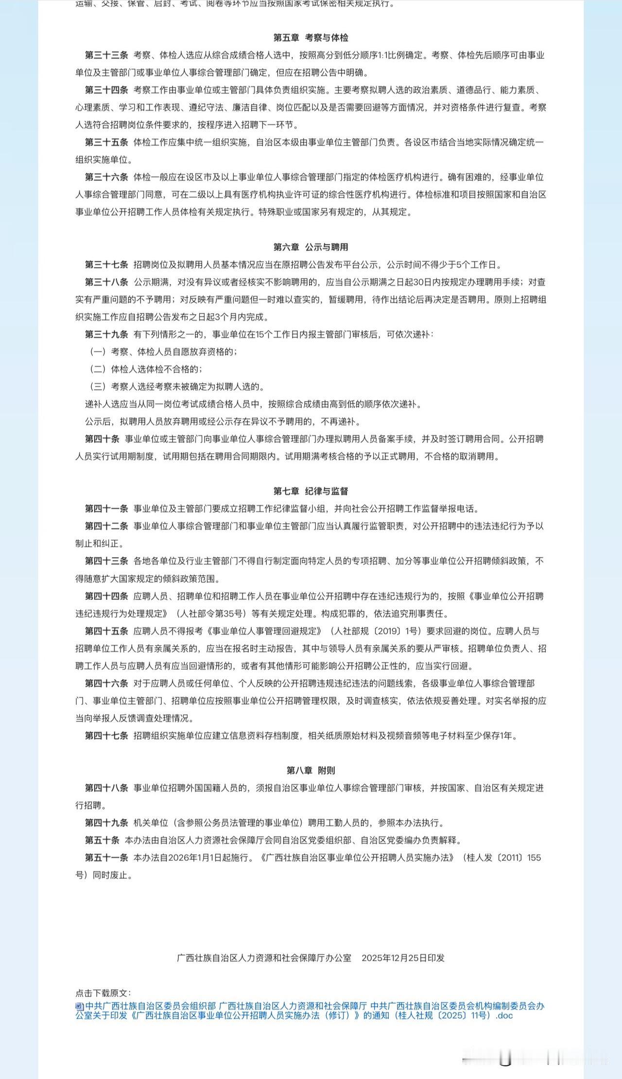 新版《广西事业单位公开招聘人员实施办法》发布,于2026年1月1日起实施,全文可以说是“动真格的”,瞄准了老百姓最反感的那些招聘乱象,这个新办法对想考事业单位的普通人来说是大利好[赞] 简单说就三点: 1、这是“紧箍咒”:专门治各种“萝卜招聘”和“内部操作”。以前那种“简历筛选”、偷偷面试、随意加分的“小动作”,现在被明确叫停。它把“公开、公平”这四个字用具体规定焊死了。 2、这是“标准流程”:以前各单位招聘花样百出,现在强调“能统一就统一”,特别是笔试。这就好比从“自由市场摆摊”变成“统一标准化考场”,对普通人来说更透明,更好操作,也堵住了很多“因人设岗”的后门。 3、这是“安全阀”:文件里反复提“风险”,就是怕再出考试泄题、组织混乱这种大事。现在从命题到考试组织都定了更严的规矩,就是为了防止出事,保住招聘的公信力。 但关键还得看 “疗效” —— 规定写得再好,如果下面执行时“打折扣”、搞“灵活变通”,那还是白搭。所以,好政策出台了,下一步更得看监管部门是不是真查、真罚,让这些“红线”真正通上电[赞][赞] 冬日生活打卡季