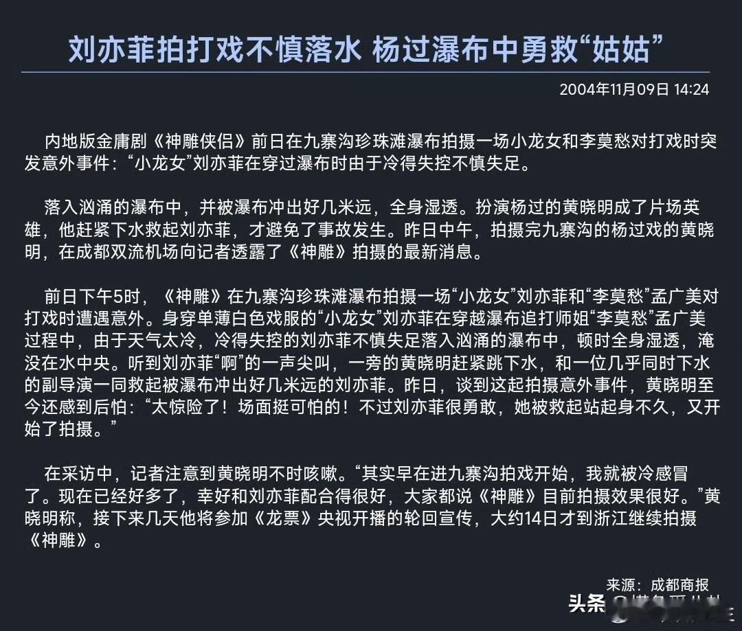 你可以说黄晓明油腻,也可以说他傻气 但不得不承认他对朋友真的很仗义 他曾跳瀑布救刘亦菲的命,当年两人一起拍神雕侠侣,刘亦菲按照剧情需要站在瀑布旁边,却不想突发意外,失足跌入水中,随后被湍急的河水卷走。 还好黄晓明立即跳水水中,和另一位同事合力救起刘亦菲,这时刘亦菲已经被水流卷走好几米远了,可见水流有多急。 所以黄晓明说救了刘亦菲一命真不是夸张说法。 有这样的交情,也难怪多年过去,刘亦菲还给黄晓明宣传作品,两个都是念旧情的人。 黄晓明