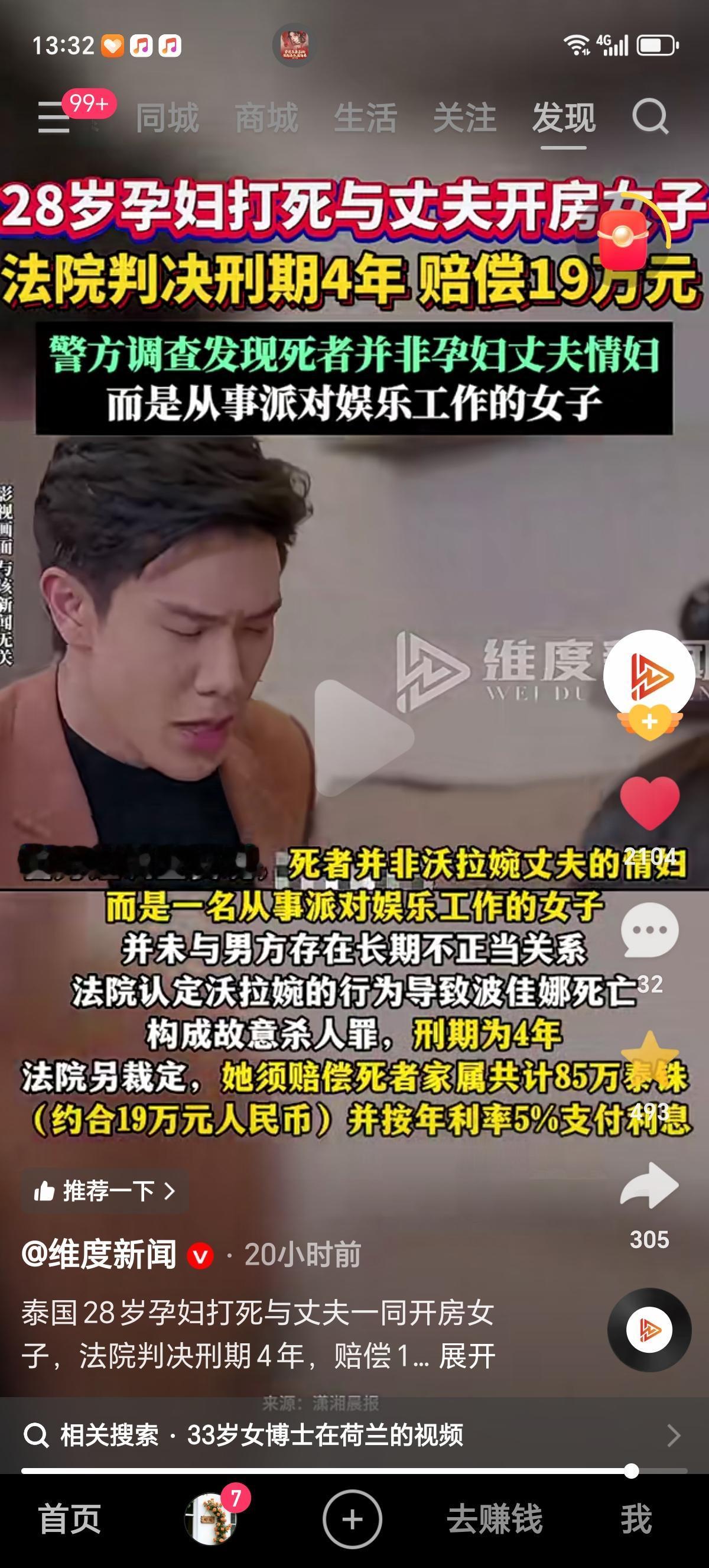 28岁怀孕8个月的女子和好友一起去旅馆捉奸,发现赤裸的丈夫和同样没穿内衣的女人后,孕妇把赤裸女人打死了。结果警方调查证实,死者波佳娜是派对娱乐工作者,并非沃拉婉丈夫的长期情妇,和孕妇没有长时间的不正当关系,只有单次接触。 法院认定沃拉婉构成故意杀人罪,原本判处8年徒刑,因她当庭认罪刑期减半为4年;同时判令其赔偿死者家属85万泰铢(约合人民币19万元),并按年利率5%计息。 家人们对这个事有啥看法呢?我个人认为被痛殴打死这个女人有点冤,也有点佩服这个孕妇的武力值。
