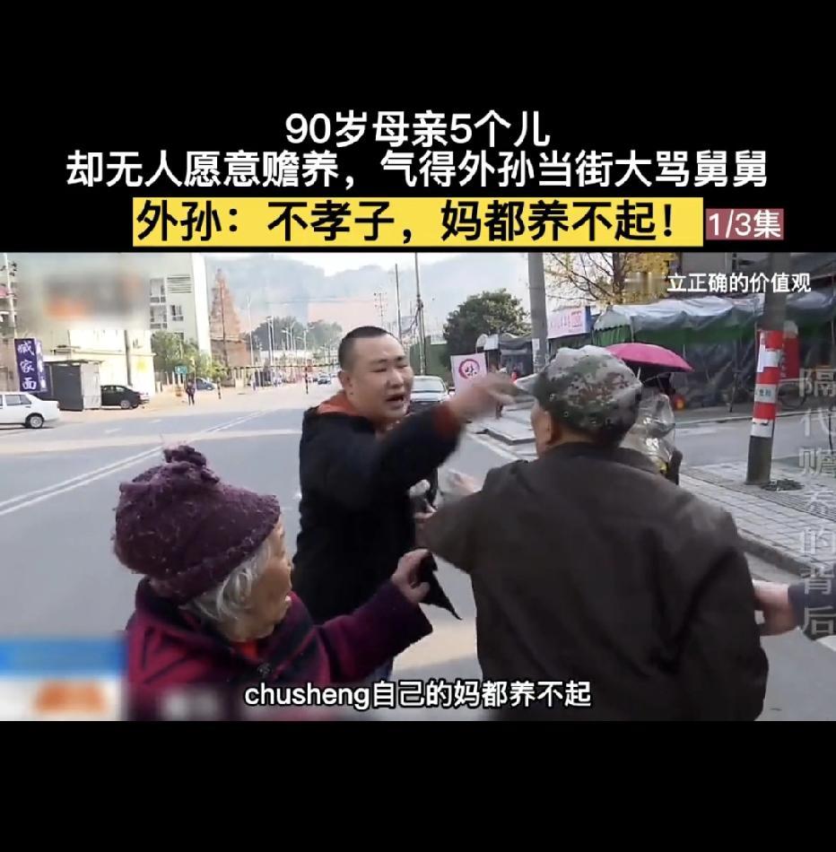 一90岁老人,辛辛苦苦养大5个儿子,可却没有一个人愿意为老人养老送终,老人走投无路之下,只能跟着外孙一起生活,谁知,这一跟就是30年,眼看家里负担越来越重,外孙想让5个舅舅承担起赡养外婆的义务,可却遭到舅舅们的破口大骂,外孙忍无可忍,直接回怼:“不孝子,连自己的亲妈都养不起。” 李婆婆今年已经90岁了,一辈子辛辛苦苦把5个儿子拉扯大,头发都熬白了,本来该好好享受晚年生活了。 可谁能想到,这5个儿子成家立业之后,全都成了“甩手掌柜”。他们都在同一个镇上住着,离老母亲住的地方最远也就几里路,走几步就能到。 但这几十年里,他们对亲妈那是完全不上心。过年过节也不去家里看望,老人生病了也不去瞧一瞧,就好像这个妈和他们一点儿关系都没有一样。 没人管李婆婆,她没办法,只能跟着外孙廖大哥一起生活。这一跟,就是整整30年。 廖大哥家里条件本来就不怎么好,普通家庭出身,没啥家底。 上面呢,要照顾身体不好、老是生病的外婆;下面呢,还得拉扯自己的一双儿女。家里的重担全压在他一个人身上,日子过得那叫一个艰难。 日子不好过,心里也累得慌。廖大哥的妻子看着家里一直这么穷,丈夫又天天没日没夜地操劳,实在是受不了了。 她不想再接着照顾李婆婆,为此夫妻俩吵了好多次架,原本好好的日子,变得鸡飞狗跳的。 廖大哥心里委屈得不行,还憋了一肚子火。他想啊,外婆可是亲舅舅们的妈,赡养老人本来就是他们该尽的责任,凭啥要自己这个外孙一直扛着啊? 想来想去,廖大哥就推着年迈的外婆,一个一个地去找舅舅们商量赡养的事儿。他就盼着舅舅们能分担一点责任,让家里能轻松一点。 可结果呢,他没得到亲情的理解和体谅,反而感受到了刺骨的冷漠。 舅舅们不但一口就拒绝了,还对着廖大哥恶语相向,脏话狠话张嘴就来。吵着吵着,几个舅舅还失去了理智,当着街坊邻居的面,对廖大哥动手了。 廖大哥看着外婆吓得瑟瑟发抖的样子,想着自己这30年为这个家付出的心血,再看看舅舅们那冷血无情的样子,一下子就彻底火了。 他站在街头,扯着嗓子大声骂道:“你们这些不孝顺的东西!连自己亲妈都养不了,还算什么人啊!” 这话一喊出来,周围围观的街坊邻居都纷纷看过来,没有一个人不说这5个儿子不对的。生养孩子的大恩比天还大,他们这么干,实在太让人寒心了。 这事儿闹大了之后,当地的工作人员就出来调解了。在众人的指责和调解人员的劝说下,5个舅舅终于松口了,承认了自己的错误。 可让人心疼的是,李婆婆哭着说不愿意搬到儿子们家里去住。这30年天天在一起生活,她早就和外孙一家亲得像一家人了,对那些冷漠的儿子们,心里只剩下疏远。 最后双方商量出了一个协议:李婆婆还是由廖大哥照顾,5个舅舅每人每个月给400块钱的赡养费。要是老人病重住院了,5个儿子轮流去照顾,所有的医疗费大家一起分担。 这场赡养老人的风波,总算是有了一个结果,可这事情里的无情和心酸,让人心里好久都平静不下来。 养儿防老,这是老一辈人一辈子的盼头。可李婆婆的这5个儿子,硬生生把这个盼头给弄没了。 赡养父母可不是能随便选做不做的,这是做子女必须得尽的法律义务,也是刻在骨子里的道德底线。 大家都在一个镇上住着,离得这么近,却对自己的亲妈不管不顾,这么冷血,根本就不配当子女。 再看看廖大哥,本来没有法律上必须赡养外婆的义务,却白白照顾了外婆30年,这份孝心和担当,真的很让人感动。 孝心这东西,不分家里有钱没钱,也不分关系亲不亲,就看有没有一颗真心。父母生养孩子的恩情,一辈子都报答不完,连自己父母都不愿意好好对待的人,迟早会被大家唾弃。 对于这件事,你是怎么看的呢?