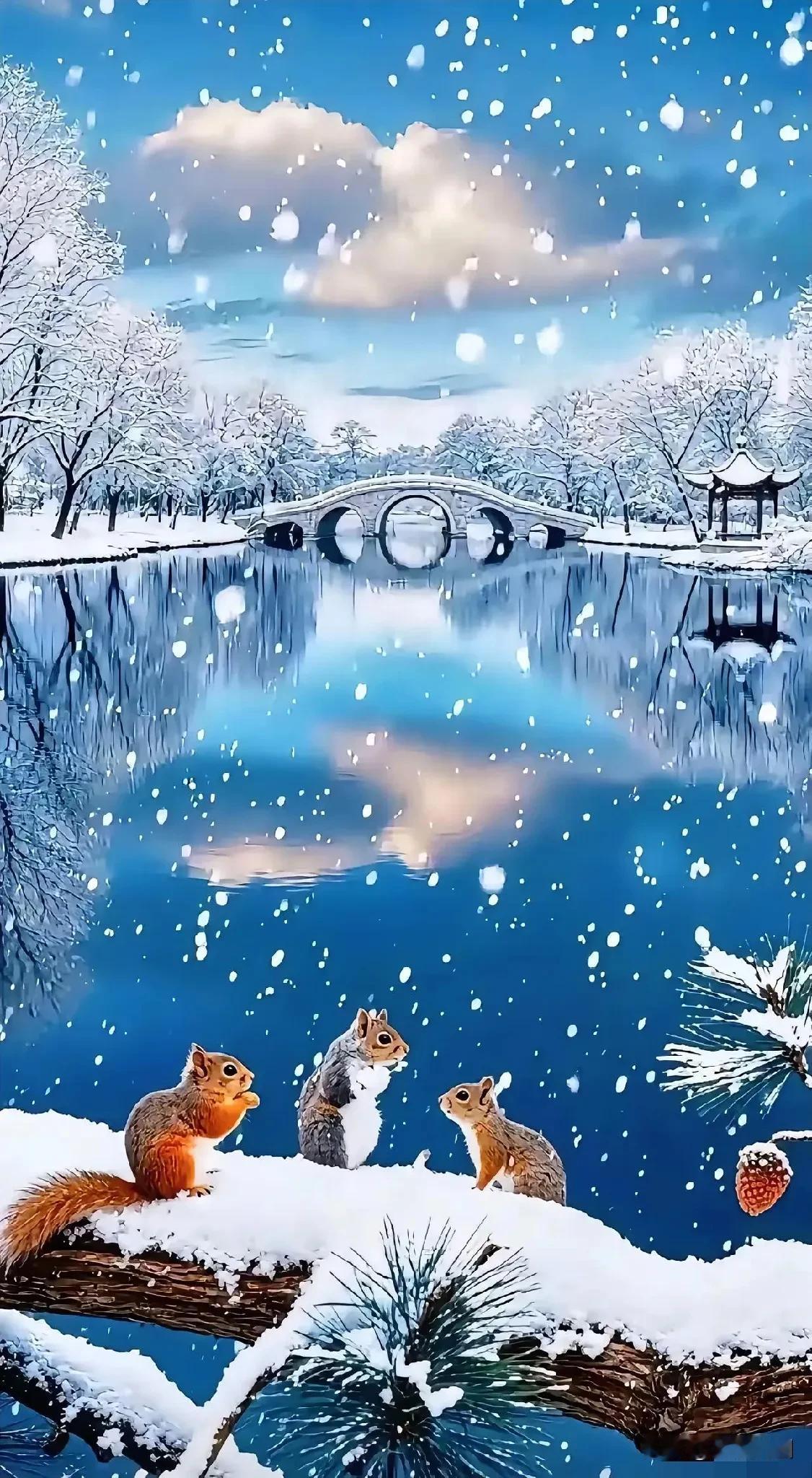 冬日雪景中的三只松鼠,静谧而温馨。