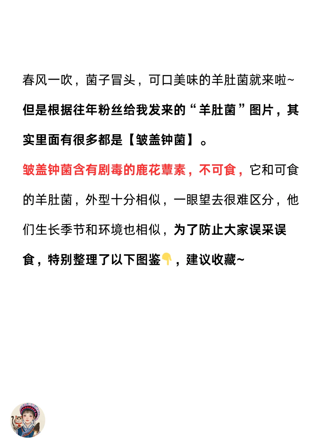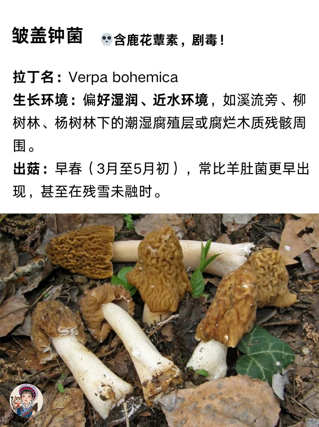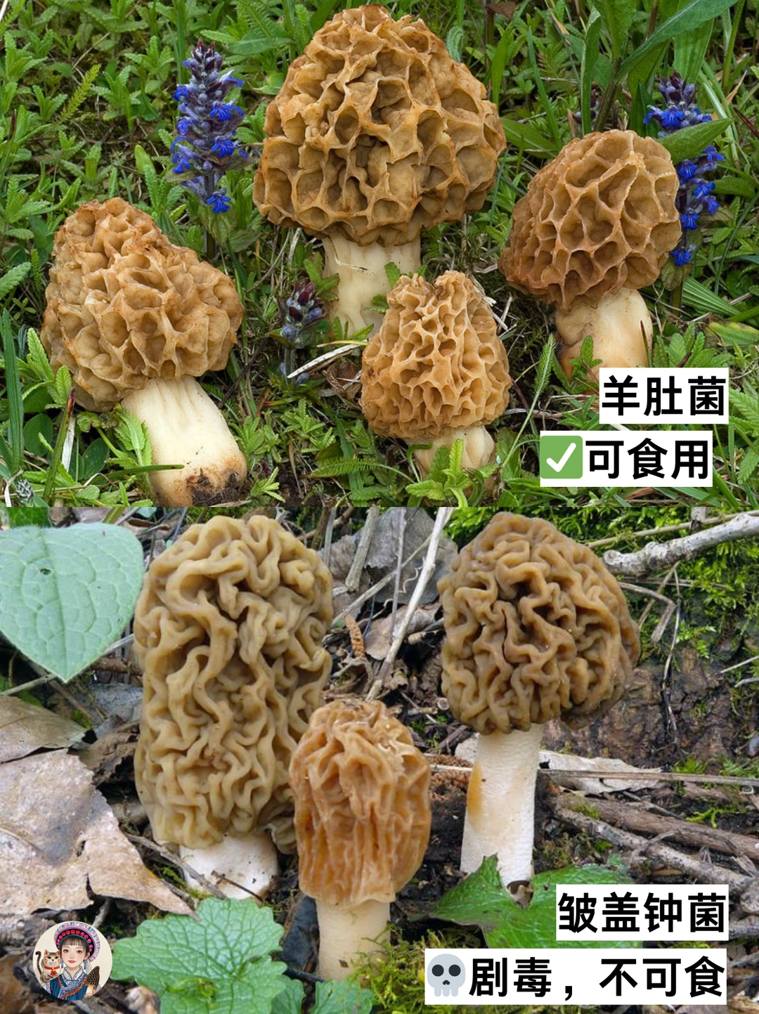 捡菌子 野生菌 蘑菇 羊肚菌 自然科普 皱盖钟菌 野生菌图鉴 菌子的季节 春风一吹,菌子冒头,可口美味的羊肚菌就来啦~ 但是根据往年粉丝给我发来的“羊肚菌”图片,其实里面有很多都是【皱盖钟菌】。 皱盖钟菌含有剧毒的鹿花蕈素,不可食,它和可食的羊肚菌,外型十分相似,一眼望去很难区分,他们生长季节和环境也相似,为了防止大家误采误食,特别整理了以下图鉴👇,建议收藏~蘑菇爱好者 可食用野生蘑菇 羊肚菌 中文名:羊肚菌 拉丁名:Morchella spp. 生长时间:春季中晚期(4月中旬至6月),气温稳定回升后。 生长环境:偏碱性肥沃土壤,常见于阔叶林(栎树、山毛榉)林缘、草丛、火烧迹地或果园。喜散射光,非高度潮湿环境。 关键提示:珍稀食用菌,不可生食,需彻底做熟。 皱盖钟菌 中文名:皱盖钟菌(波地钟菌) 拉丁名:Verpa bohemica 生长时间:早春(3月至5月初),常比羊肚菌更早出现,甚至在残雪未融时。 生长环境:偏好湿润、近水环境,如溪流旁、柳树林、杨树林下的潮湿腐殖层或腐烂木质残骸周围。 关键警示:含鹿花蕈素,剧毒! 中毒潜伏期长(6-12小时),可导致溶血、肝肾衰竭。