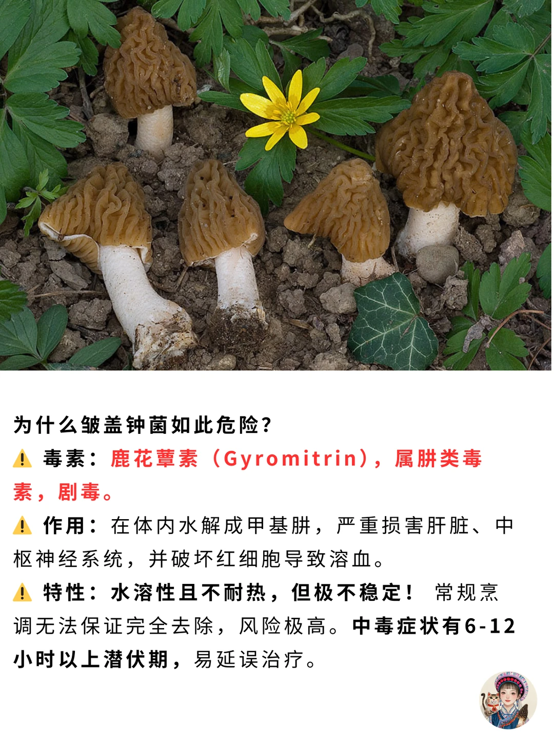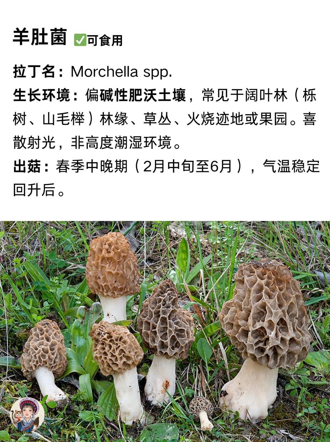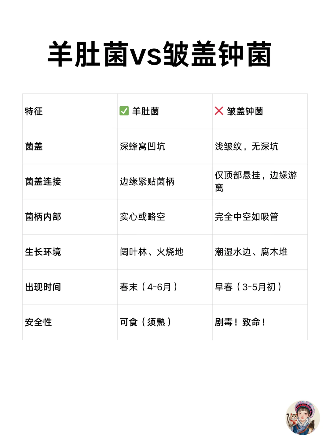 捡菌子 野生菌 蘑菇 羊肚菌 自然科普 皱盖钟菌 野生菌图鉴 菌子的季节 春风一吹,菌子冒头,可口美味的羊肚菌就来啦~ 但是根据往年粉丝给我发来的“羊肚菌”图片,其实里面有很多都是【皱盖钟菌】。 皱盖钟菌含有剧毒的鹿花蕈素,不可食,它和可食的羊肚菌,外型十分相似,一眼望去很难区分,他们生长季节和环境也相似,为了防止大家误采误食,特别整理了以下图鉴👇,建议收藏~蘑菇爱好者 可食用野生蘑菇 羊肚菌 中文名:羊肚菌 拉丁名:Morchella spp. 生长时间:春季中晚期(4月中旬至6月),气温稳定回升后。 生长环境:偏碱性肥沃土壤,常见于阔叶林(栎树、山毛榉)林缘、草丛、火烧迹地或果园。喜散射光,非高度潮湿环境。 关键提示:珍稀食用菌,不可生食,需彻底做熟。 皱盖钟菌 中文名:皱盖钟菌(波地钟菌) 拉丁名:Verpa bohemica 生长时间:早春(3月至5月初),常比羊肚菌更早出现,甚至在残雪未融时。 生长环境:偏好湿润、近水环境,如溪流旁、柳树林、杨树林下的潮湿腐殖层或腐烂木质残骸周围。 关键警示:含鹿花蕈素,剧毒! 中毒潜伏期长(6-12小时),可导致溶血、肝肾衰竭。