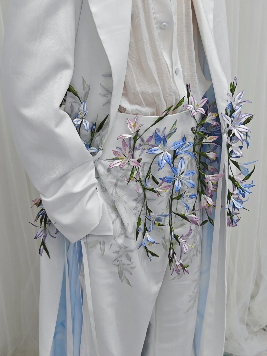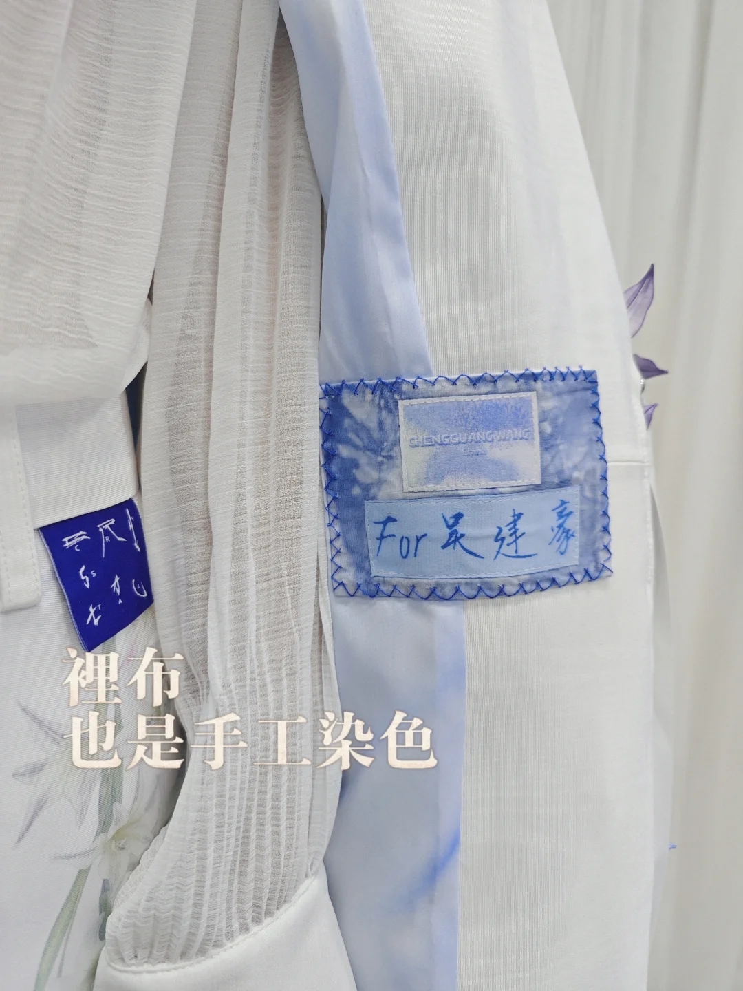 💙圖10,掀開衣服可以看到裡布也是手工染色,特意做了輕微紋理,在舞台上隨著動作可以透出淡淡的藍