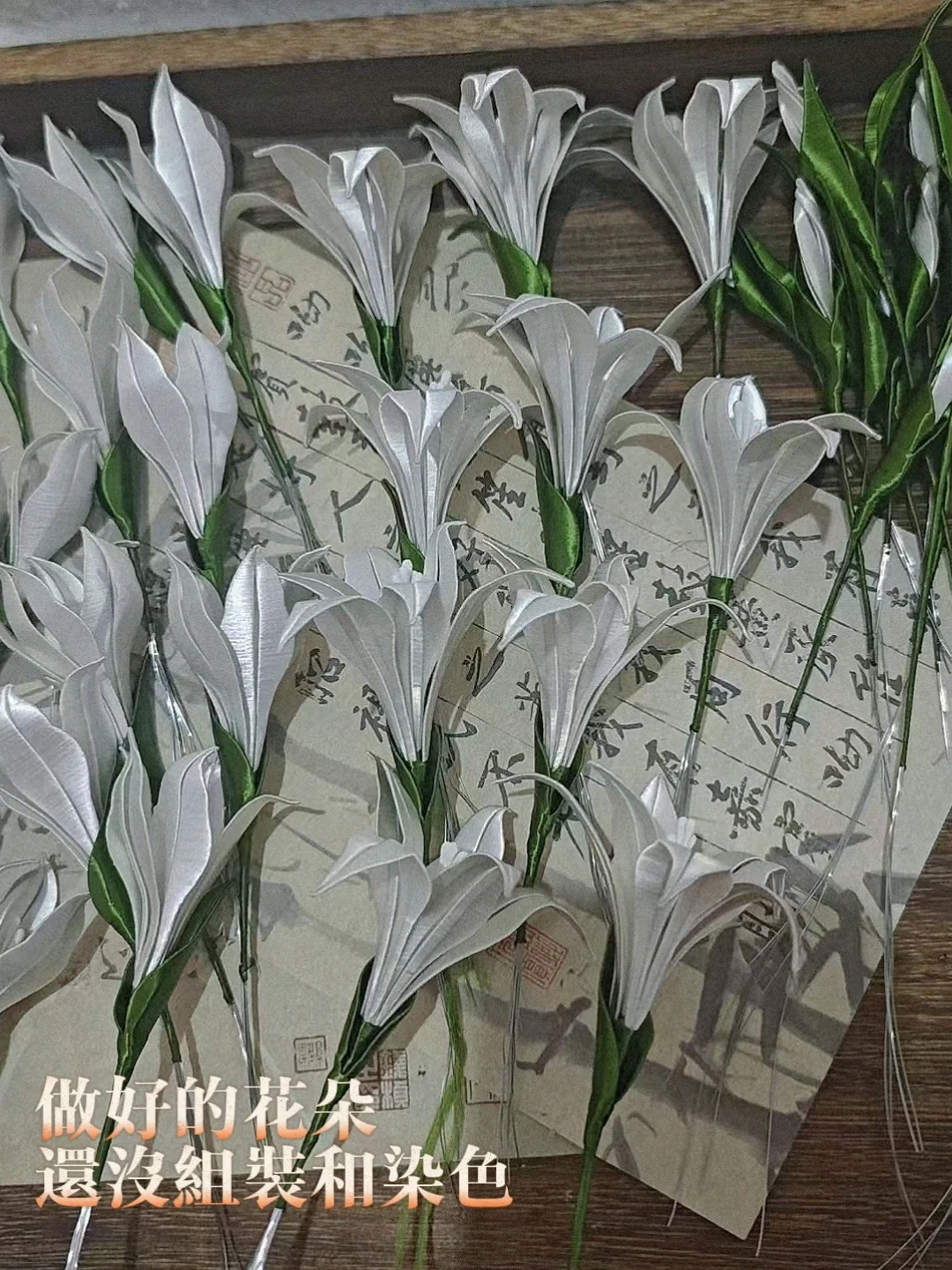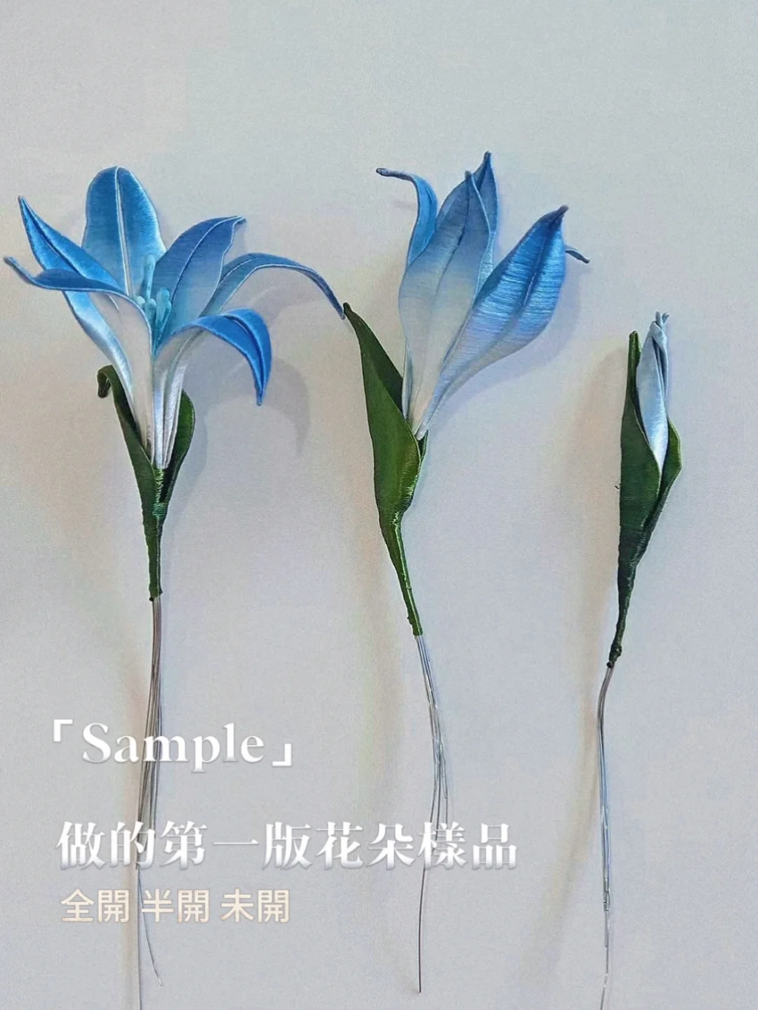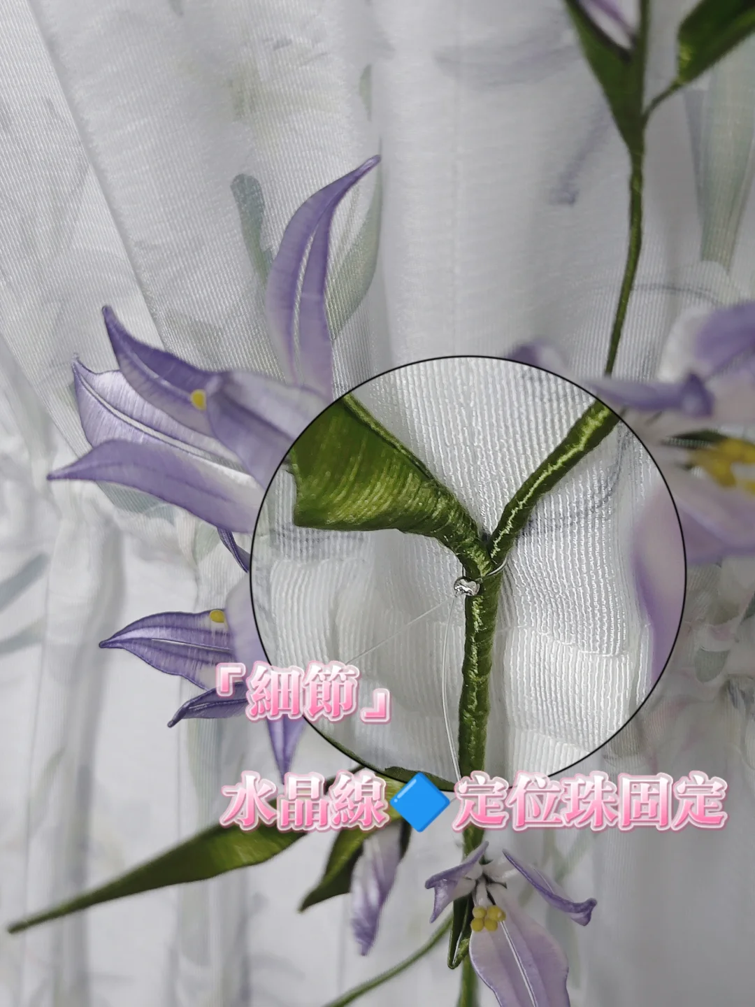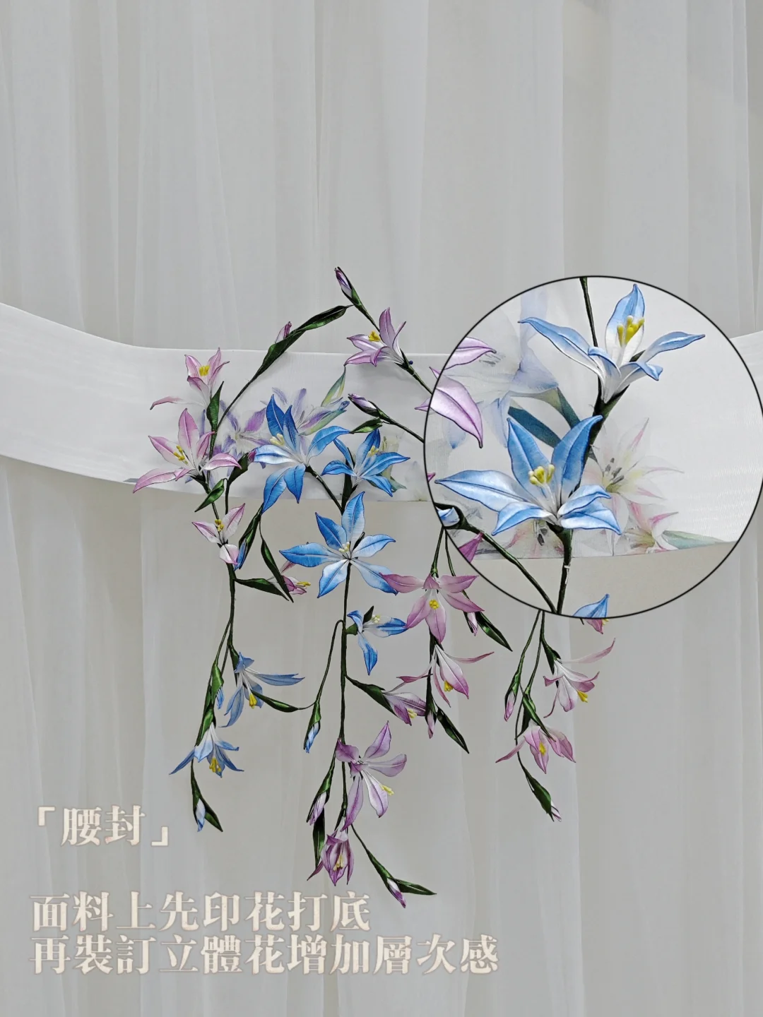 💙圖11—圖13,花朵的製作採用了傳統非遺纏花工藝,全部由絲線手工纏繞而成,並手工著色,內嵌有金屬絲,花和枝條可以隨心捏塑造型