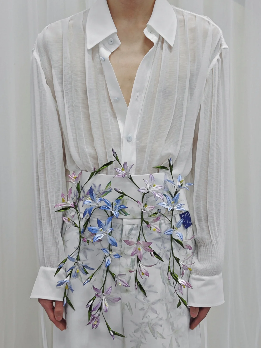 💙圖7襯衫,選用了60%左右透明度的壓褶面料,褶子是大褶兼小褶,裁剪時互相顛倒了一下,前片和袖子從上往下大褶過度到小褶,袖口那裡可以看到,後片則是小褶過度為大褶,似折扇展開的下擺