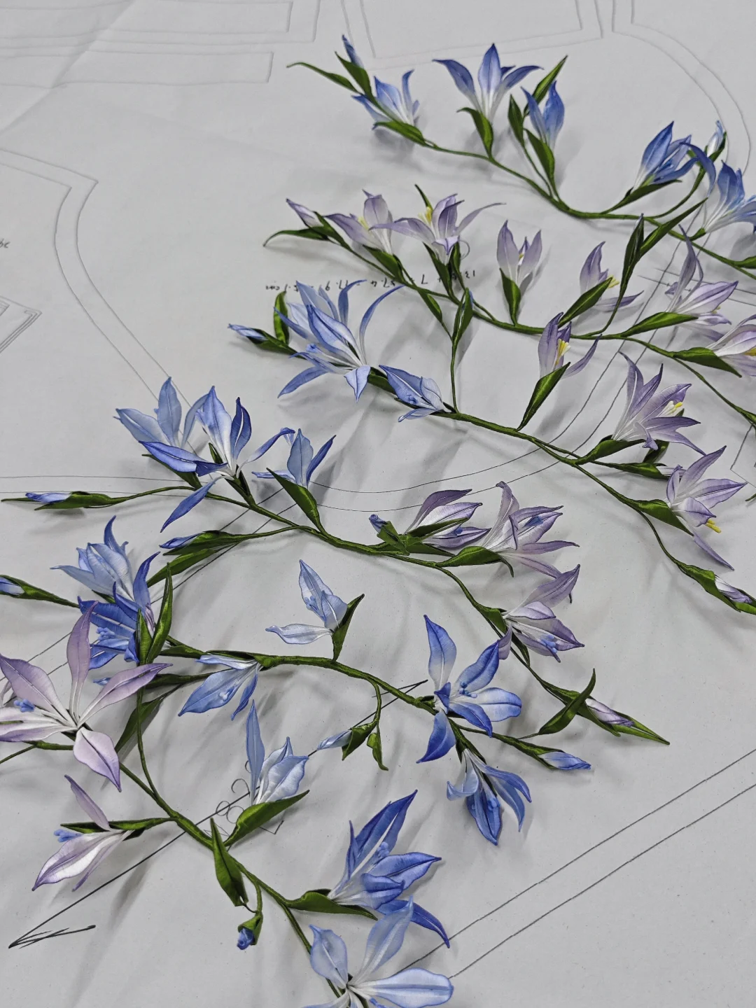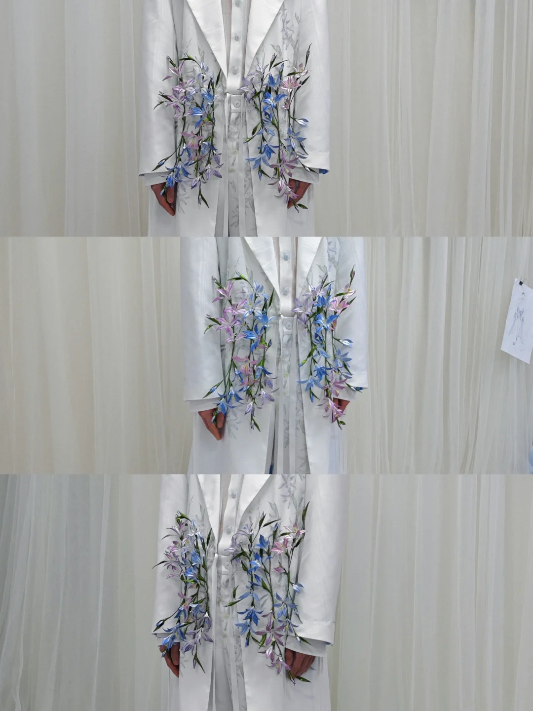 🤍大家應該有疑問為什麼實際花朵的位置和圖紙上不一樣,是因為試裝綵排後發現動作太大,花朵在腰部一周會有所影響,所以調整了位置